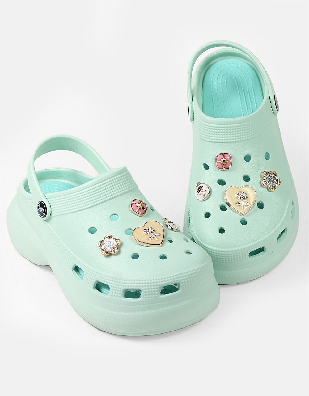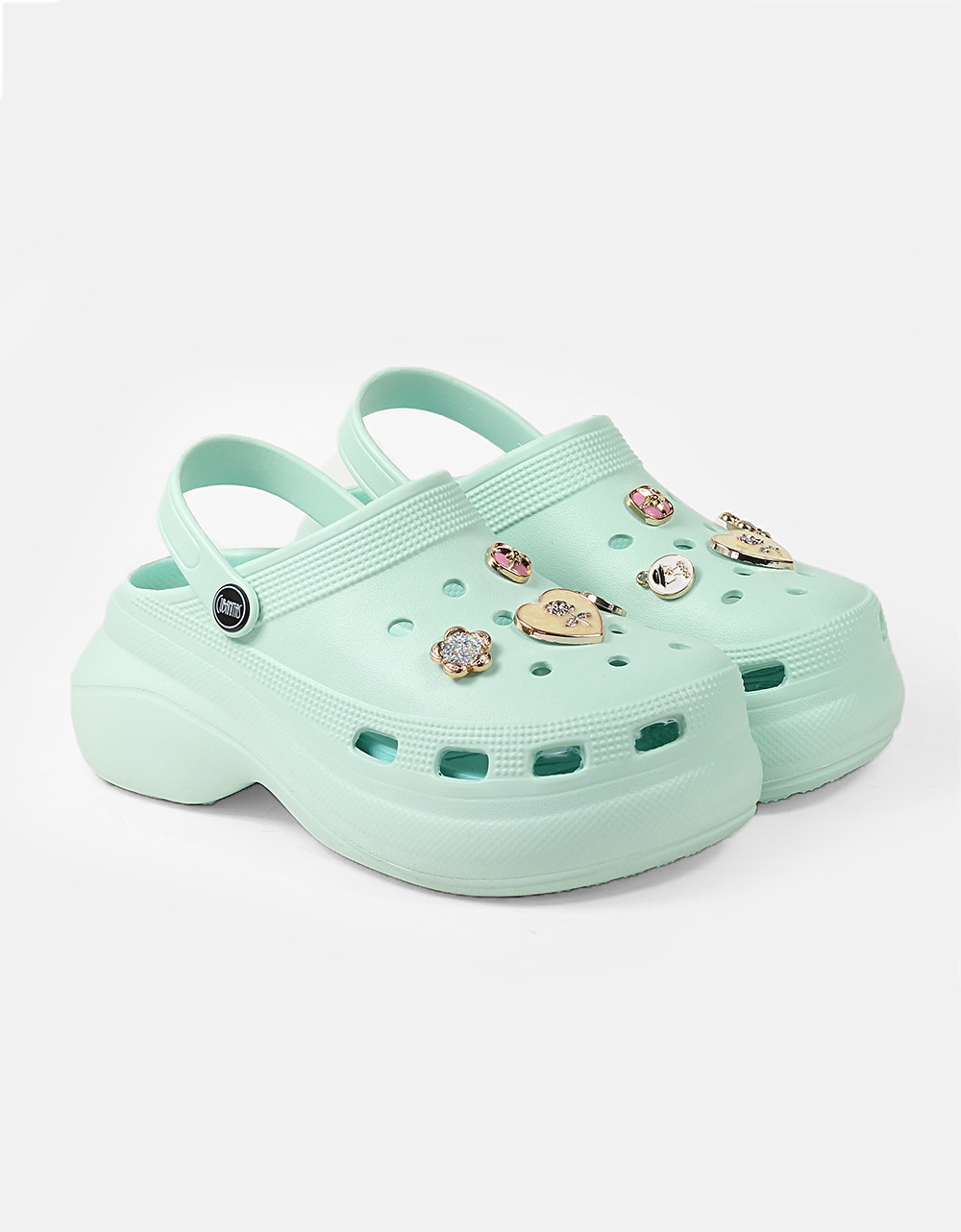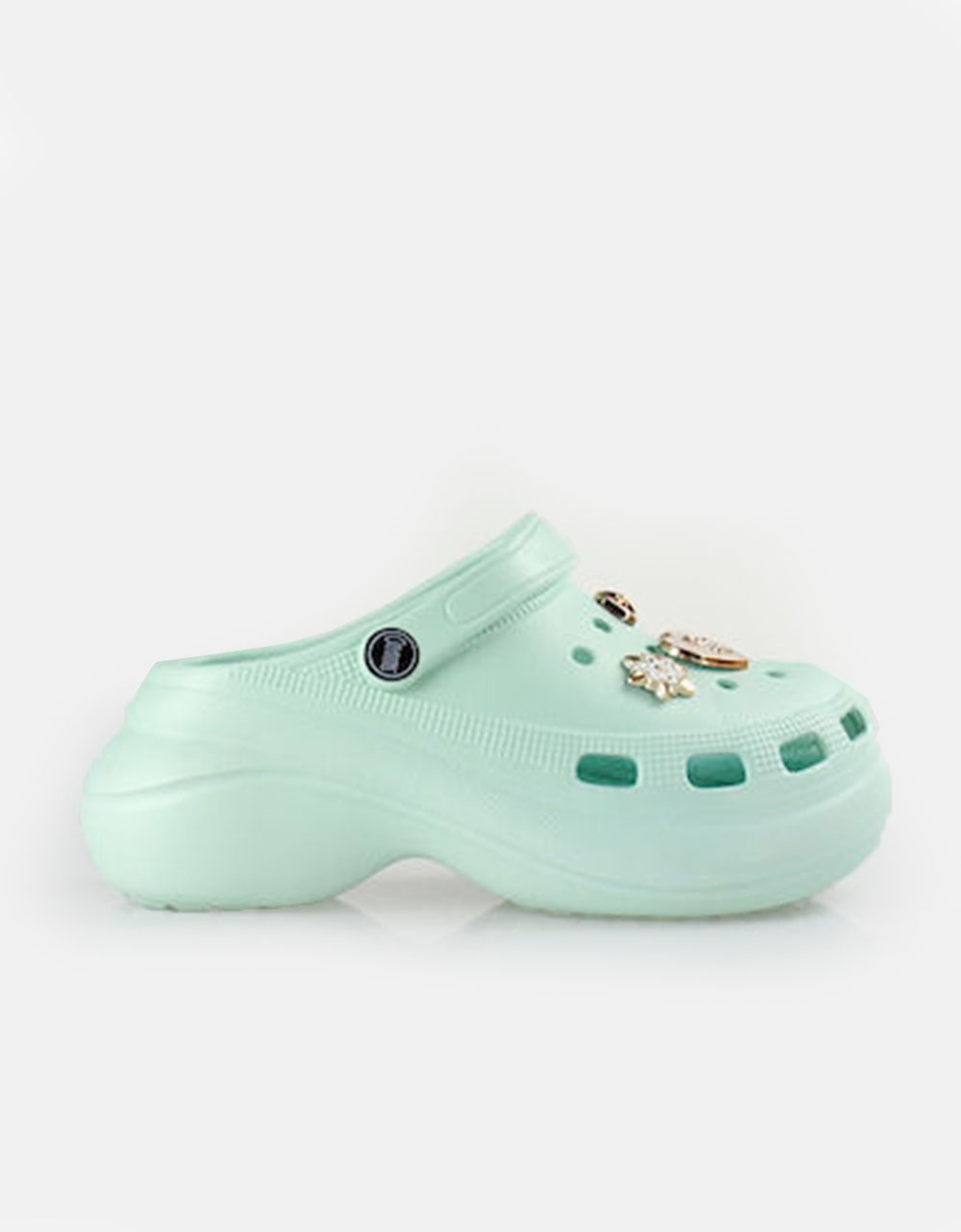 Γυναικεία σαμπό σε καλοκαιρινές αποχρώσεις. Διαθέτουν αποσπώμενα μεταλλικά διακοσμημένα με strass και λουράκι πίσω για να κρατά σταθερό το πόδι.