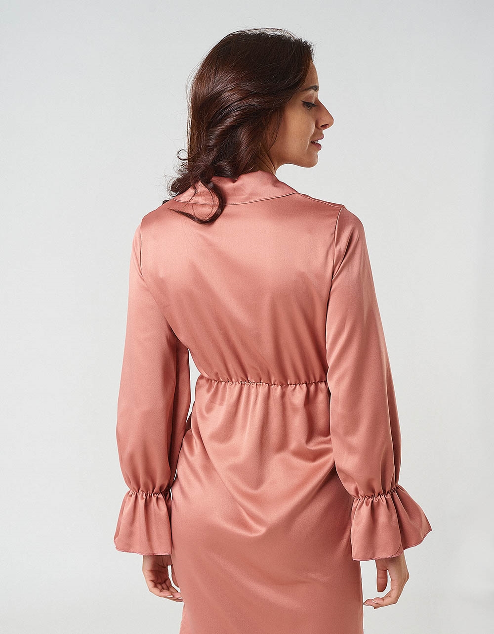 Σατέν midi φόρεμα σε στενή γραμμή με ιδιαίτερο δέσιμο. Διαθέτει μακριά μανίκια με βολάν και κρουαζέ μπούστο, άριστης ποιότητας Made in Italy. -Διαστάσεις μοντέλου -Ύψος: 1.80m -Στήθος: 84cm -Μέση: 62cm -Περιφέρεια: 91cm