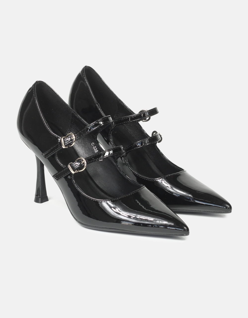 Μονοχρώμες λουστρίνι γόβες με διπλή μπαρέτα και λεπτό τακούνι Μαύρο