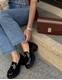 Loafers λουστρίνι με μεταλλική λεπτομέρεια. Διαθέτουν χαμηλό τετράγωνο τακούνι και chunky ελαστική σόλα για άνετο και σταθερό βάδισμα.