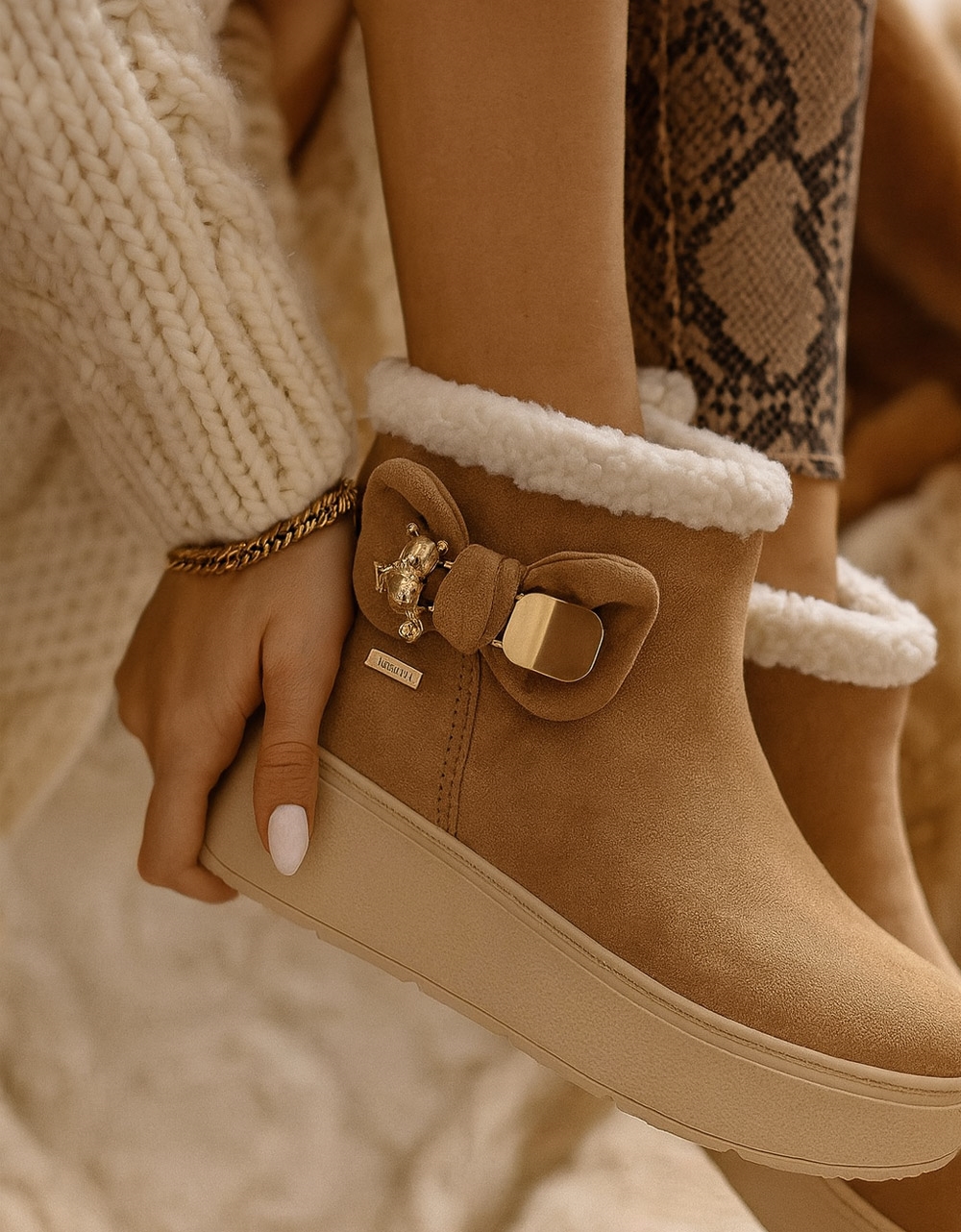 Suede μποτάκια μονόχρωμα με διακοσμητικό. Διαθέτουν εσωτερικά επένδυση από συνθετικό γουνάκι και διπλή αντιολισθητική σόλα για άνετο βάδισμα.