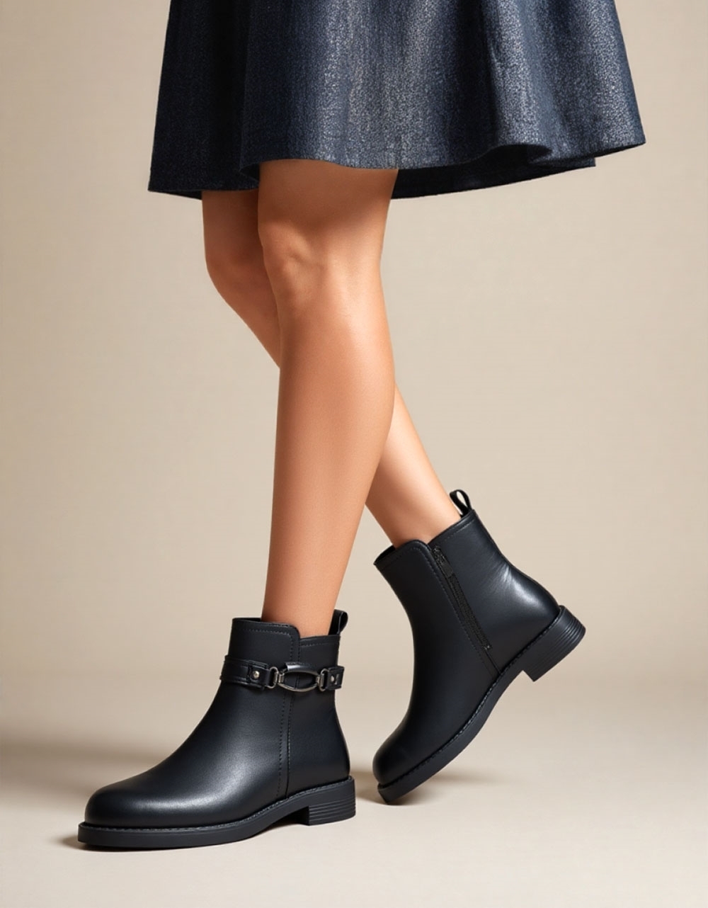 Γυναικεία μποτάκια flat με διακριτική αγκράφα. Διαθέτουν ελαστική και αντιολισθητική σόλα για άνετο βάδισμα καθόλη τη διάρκεια της ημέρας.