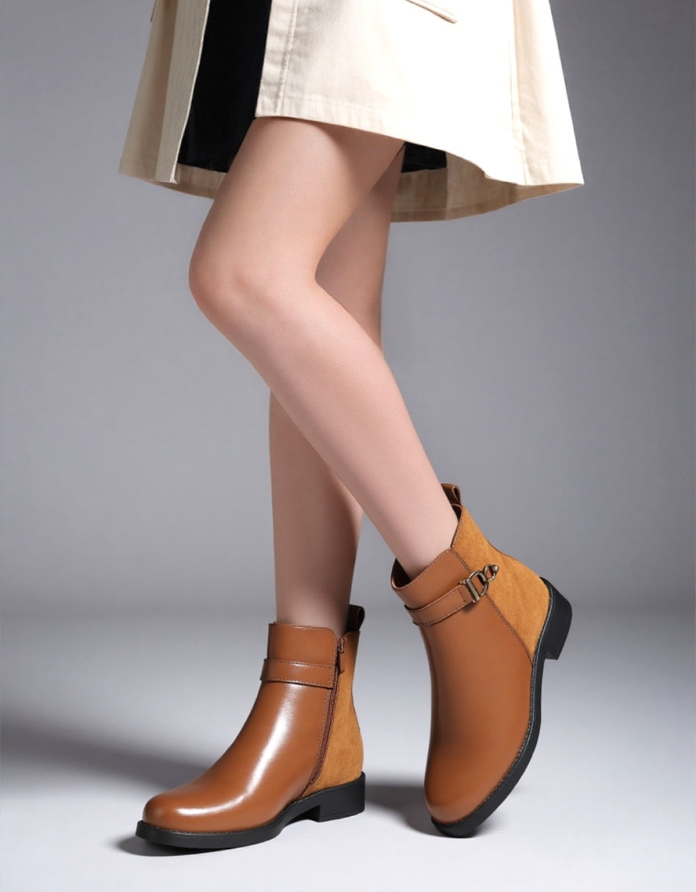 Γυναικεία μποτάκια flat με συνδιασμό υλικών. Διαθέτουν ελαστική και αντιολισθητική σόλα για άνετο βάδισμα καθόλη τη διάρκεια της ημέρας.