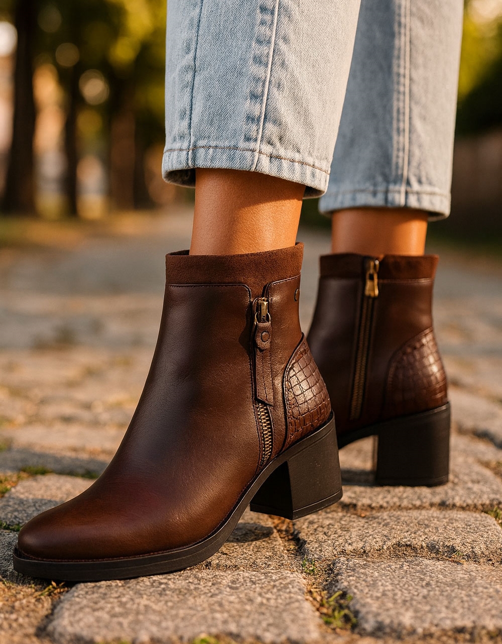 Γυναικεία μποτάκια με διπλό υλικό και χαμηλό τακούνι Καφέ