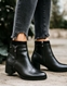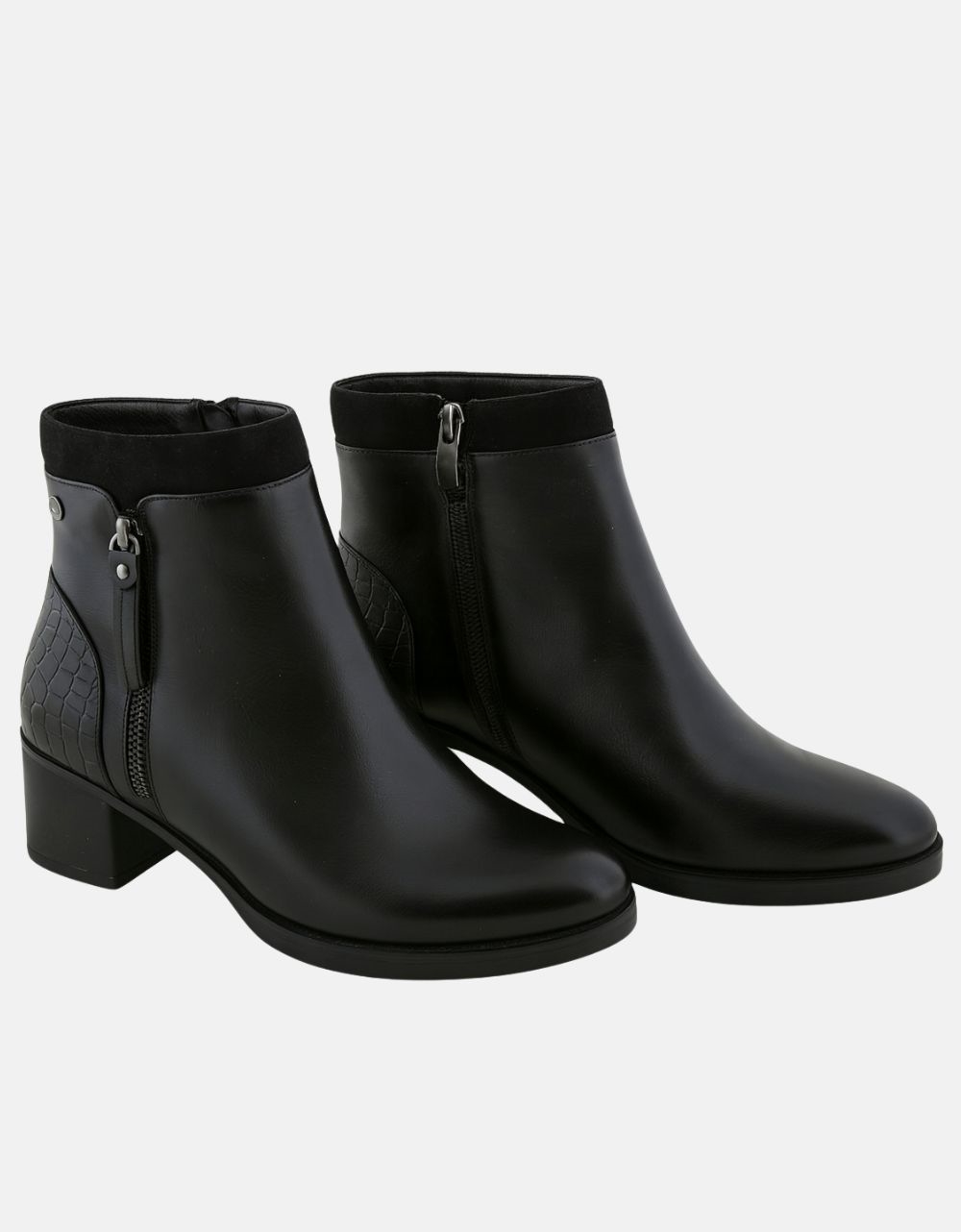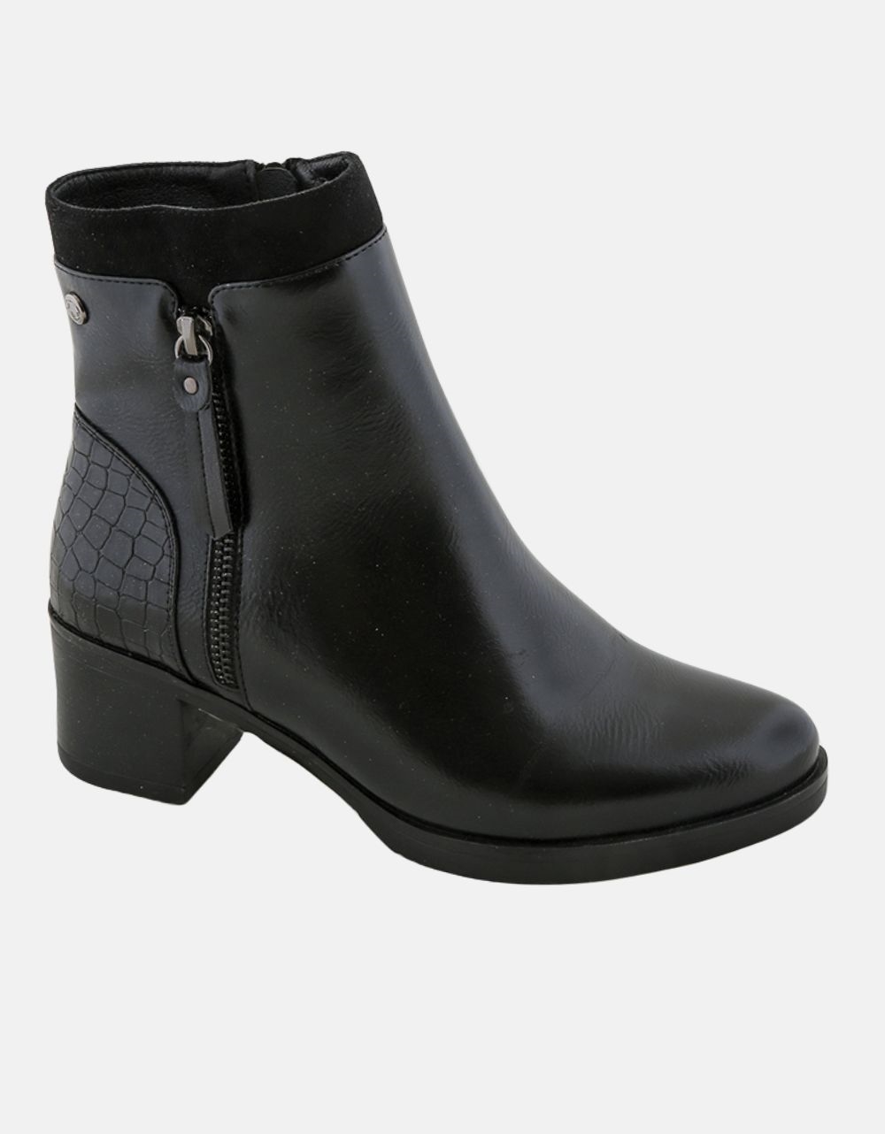 Γυναικεία μποτάκια με διπλό υλικό και χαμηλό τακούνι. Διαθέτουν φερμουάρ για εύκολη εφαρμογή και αντιολισθητική σόλα για άνετο βάδισμα.