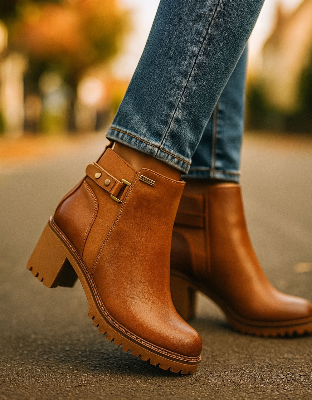Γυναικεία μποτάκια με διπλό υλικό και χαμηλό τακούνι. Διαθέτουν φερμουάρ για εύκολη εφαρμογή και αντιολισθητική σόλα για άνετο βάδισμα.