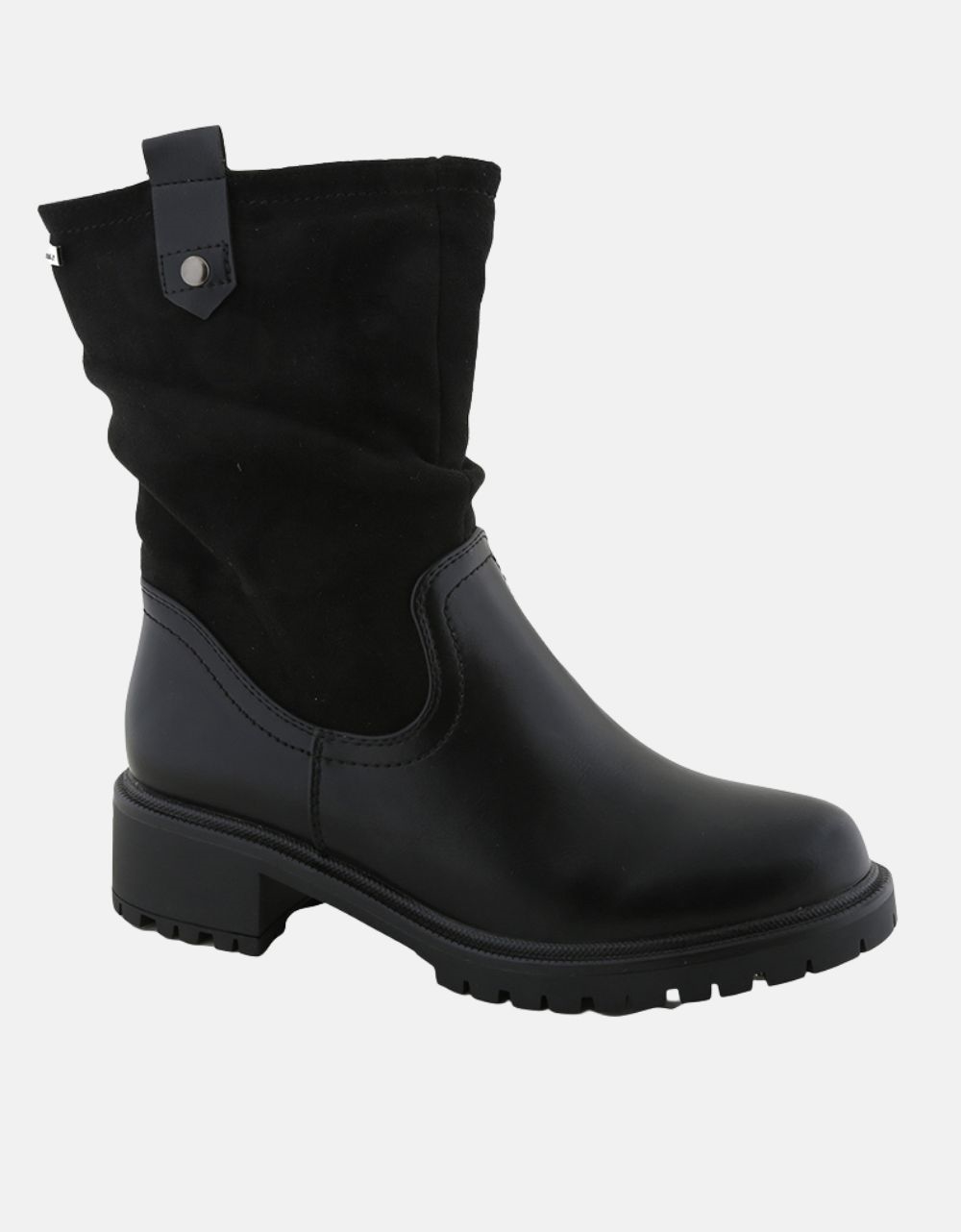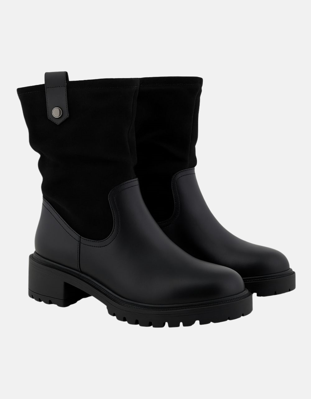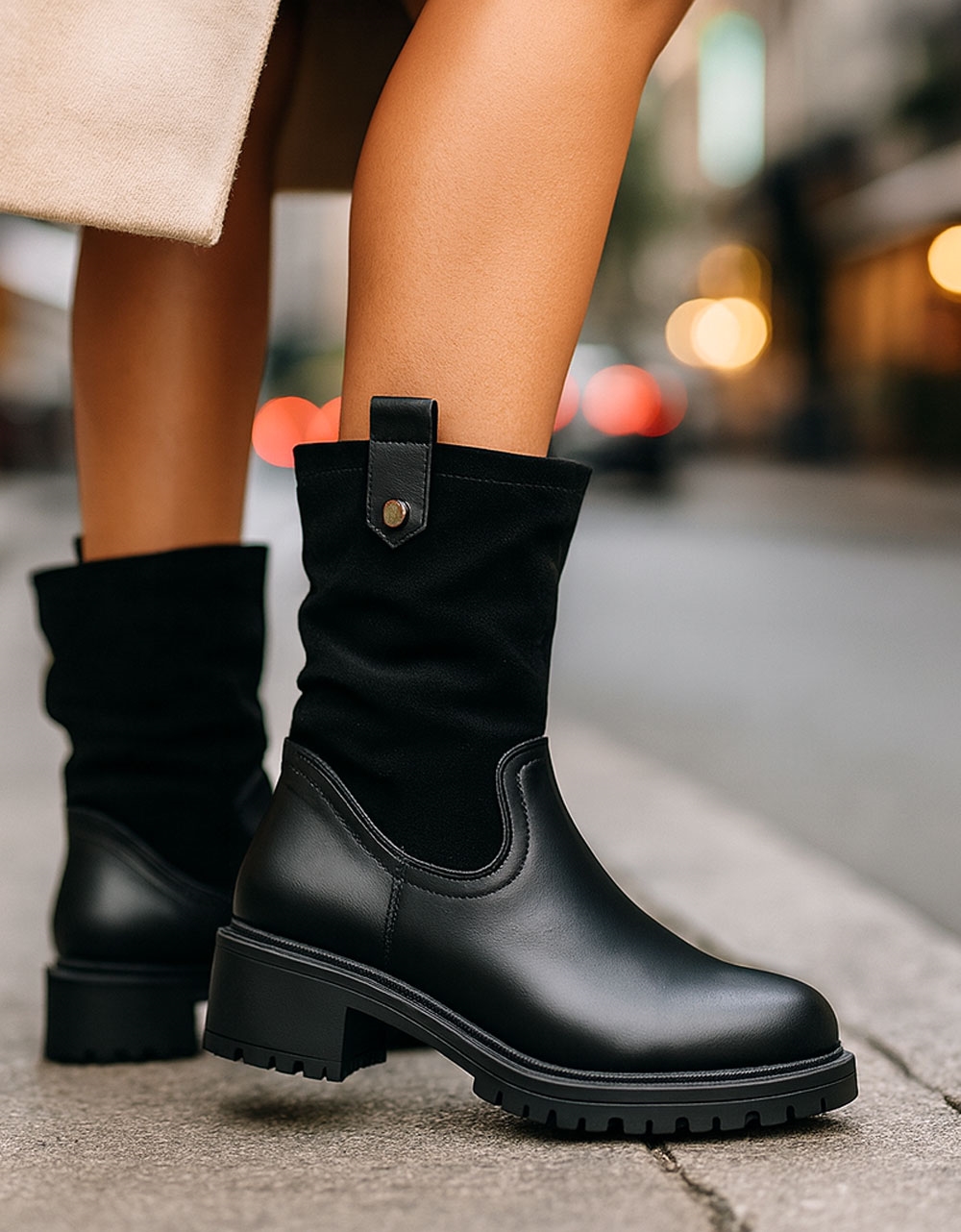 Γυναικεία μποτάκια με σούρα και διπλό υλικό. Διαθέτουν αντιολισθητική σόλα για άνετο βάδισμα.