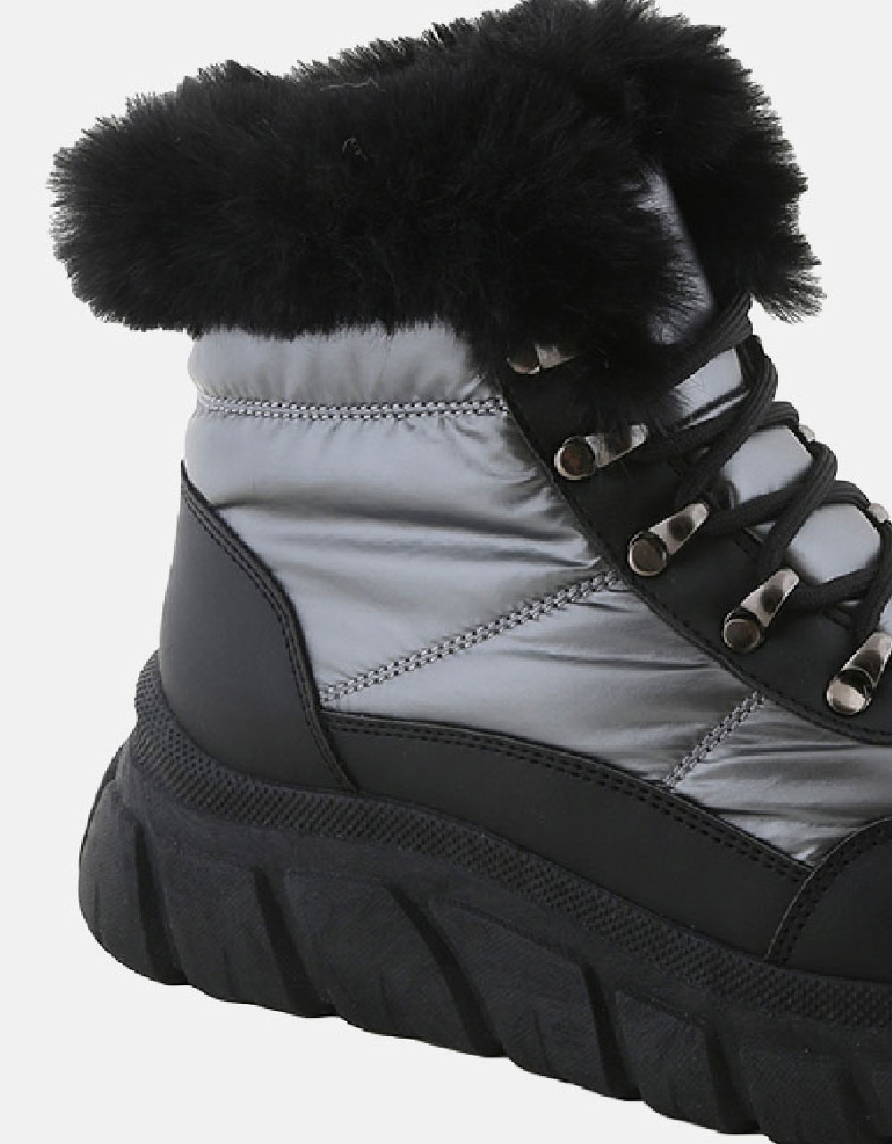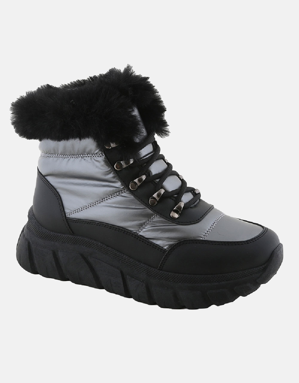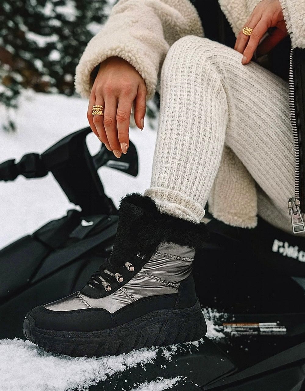 Γυναικεία δίσολα μποτάκια με συνδιασμό υλικών . Διαθέτουν εσωτερικά επένδυση από συνθετικό γουνάκι και διπλή αντιολισθητική σόλα για άνετο βάδισμα.