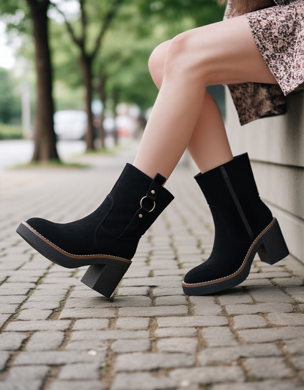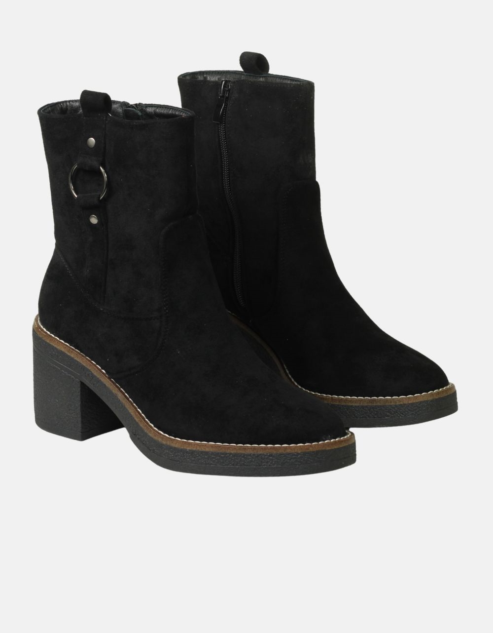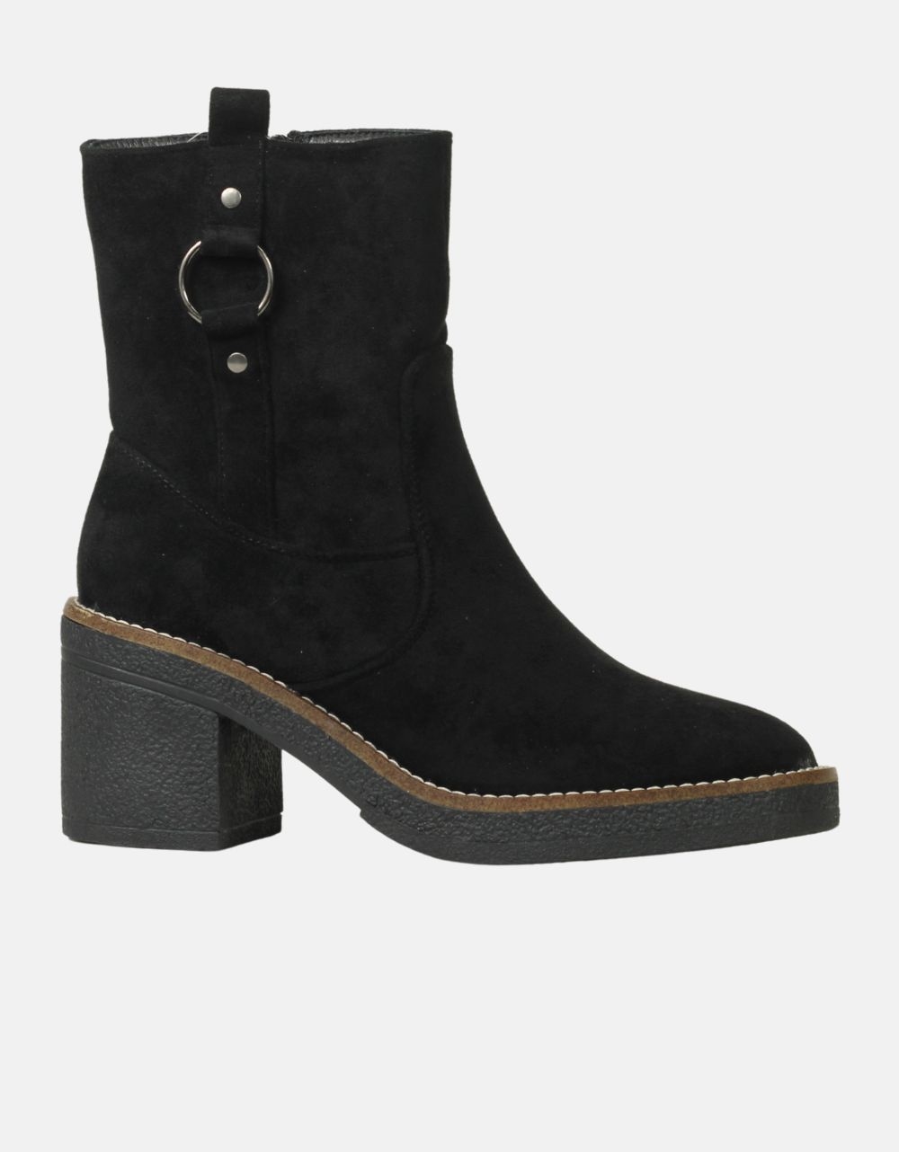 Γυναικεία μποτάκια suede με διακοσμητικό κρίκο. Διαθέτουν ελαστική, αντιολισθητική σόλα και σταθερό τετράγωνο τακούνι για άνετο βάδισμα.