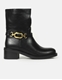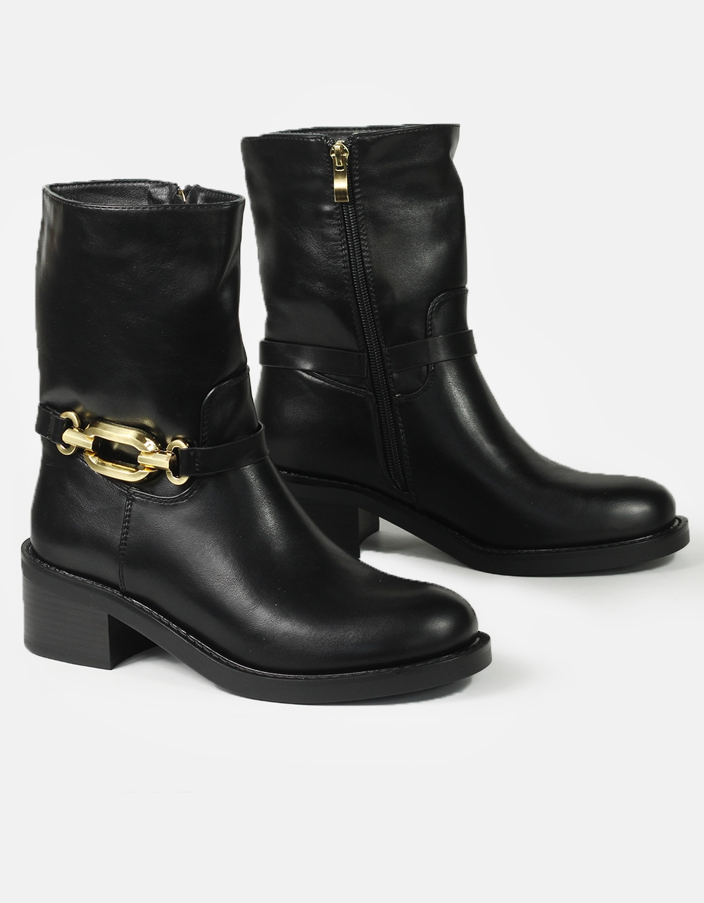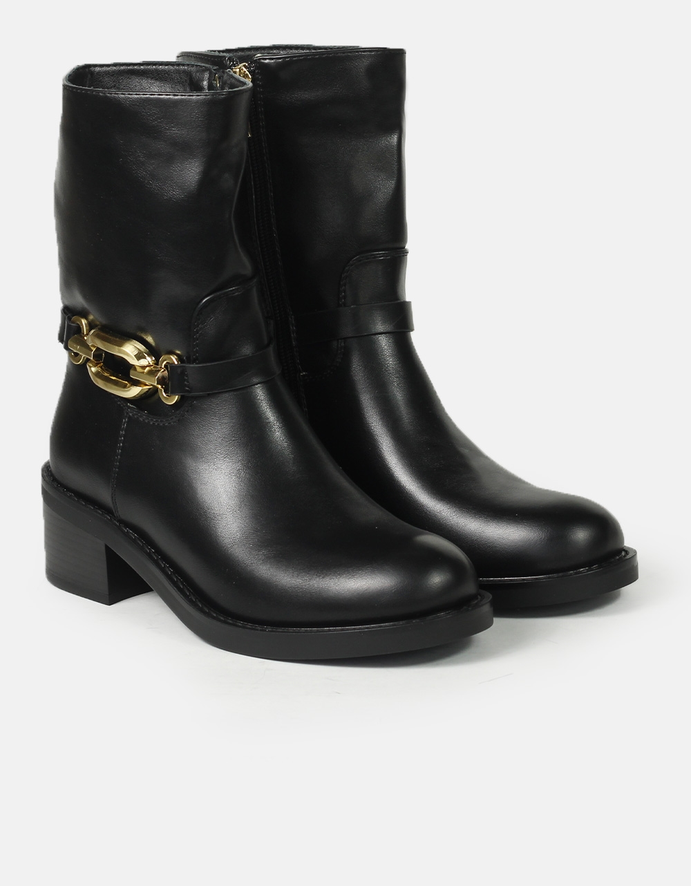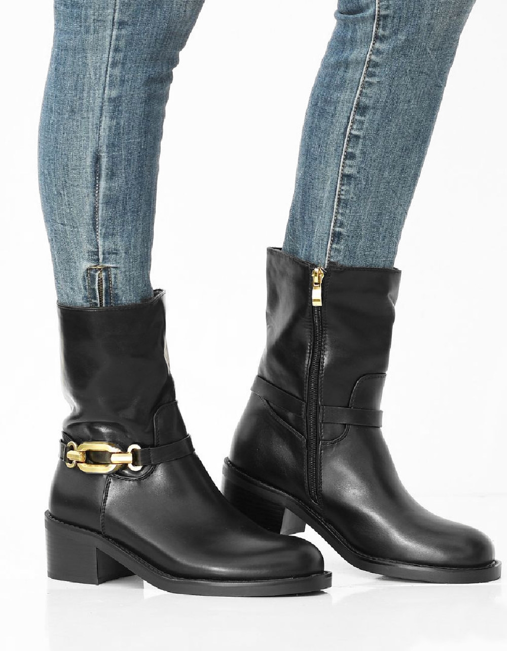 Μονόχρωμα μποτάκια σε καρέ γραμμή και μεταλλική αγκράφα. Διαθέτουν ελαστική και αντιολισθητική σόλα καθως και χαμηλό τακούνι για άνετο βάδισμα καθόλη τη διάρκεια της ημέρας.