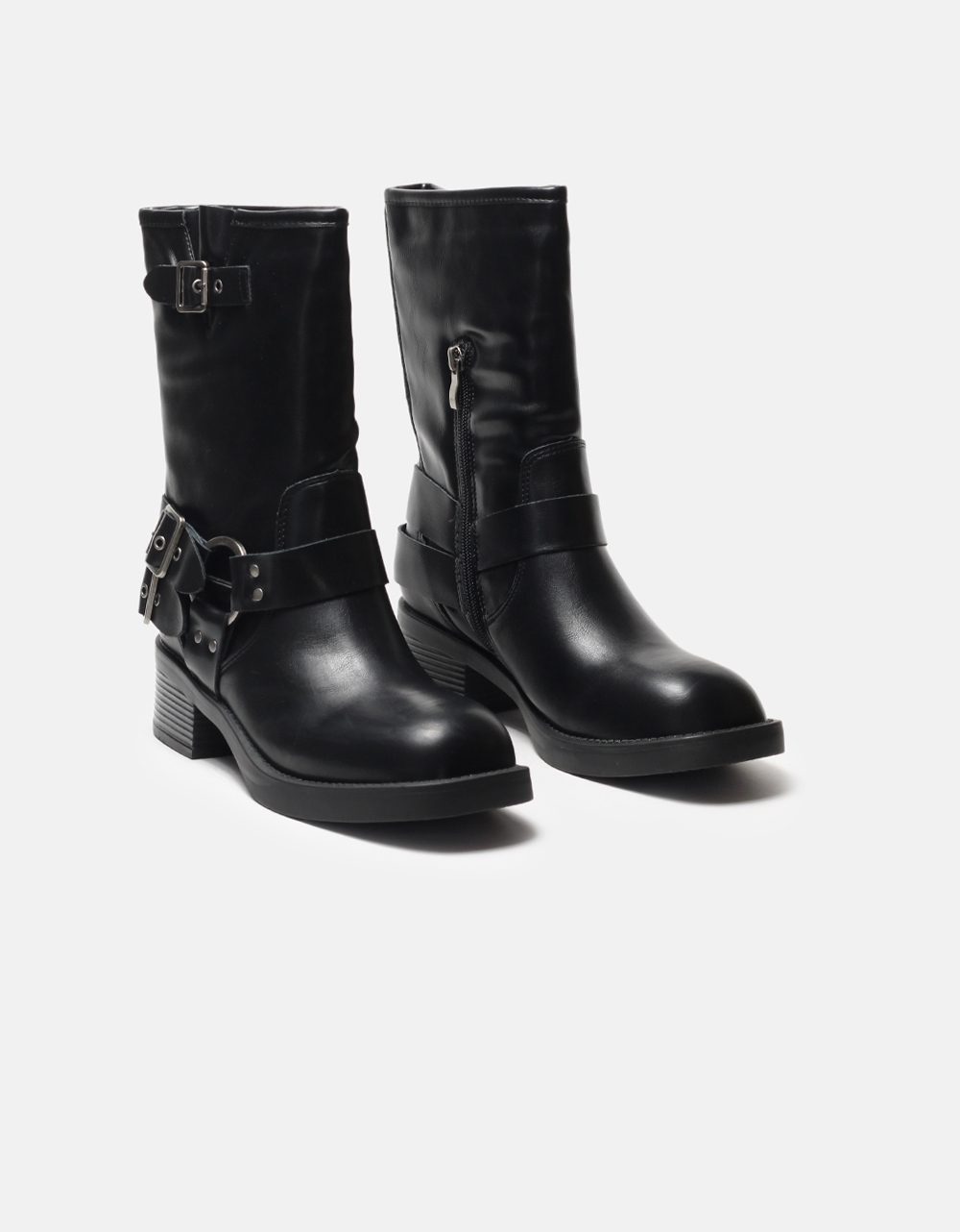 Μποτάκια bikers με διακοσμητικούς τοκάδες. Διαθέτουν διακοσμητικά λουράκια και τρουκς, ενώ κλείνουν με φερμουάρ στο πλάι.