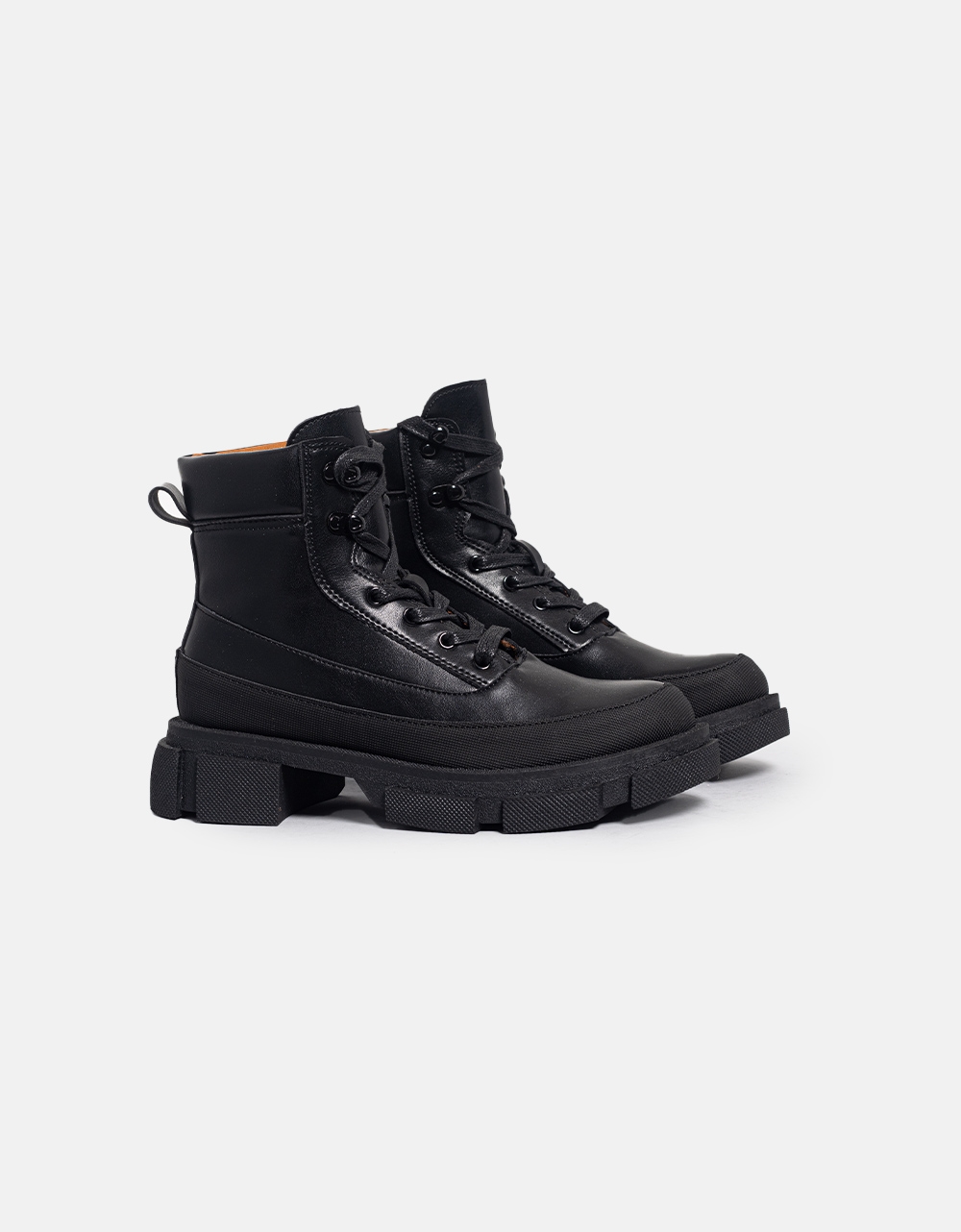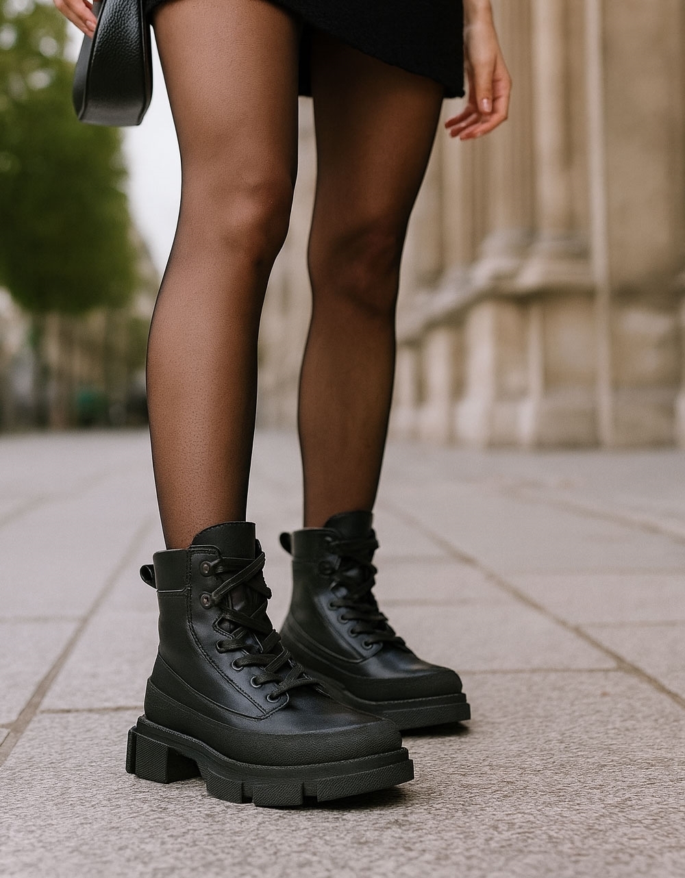 Mποτάκια μονόχρωμα με διπλή ελαστική σόλα και συνδυασμό υλικών. Δένουν με κορδόνια και είναι κατασκευασμένα από άριστης ποιότητας τεχνόδερμα.