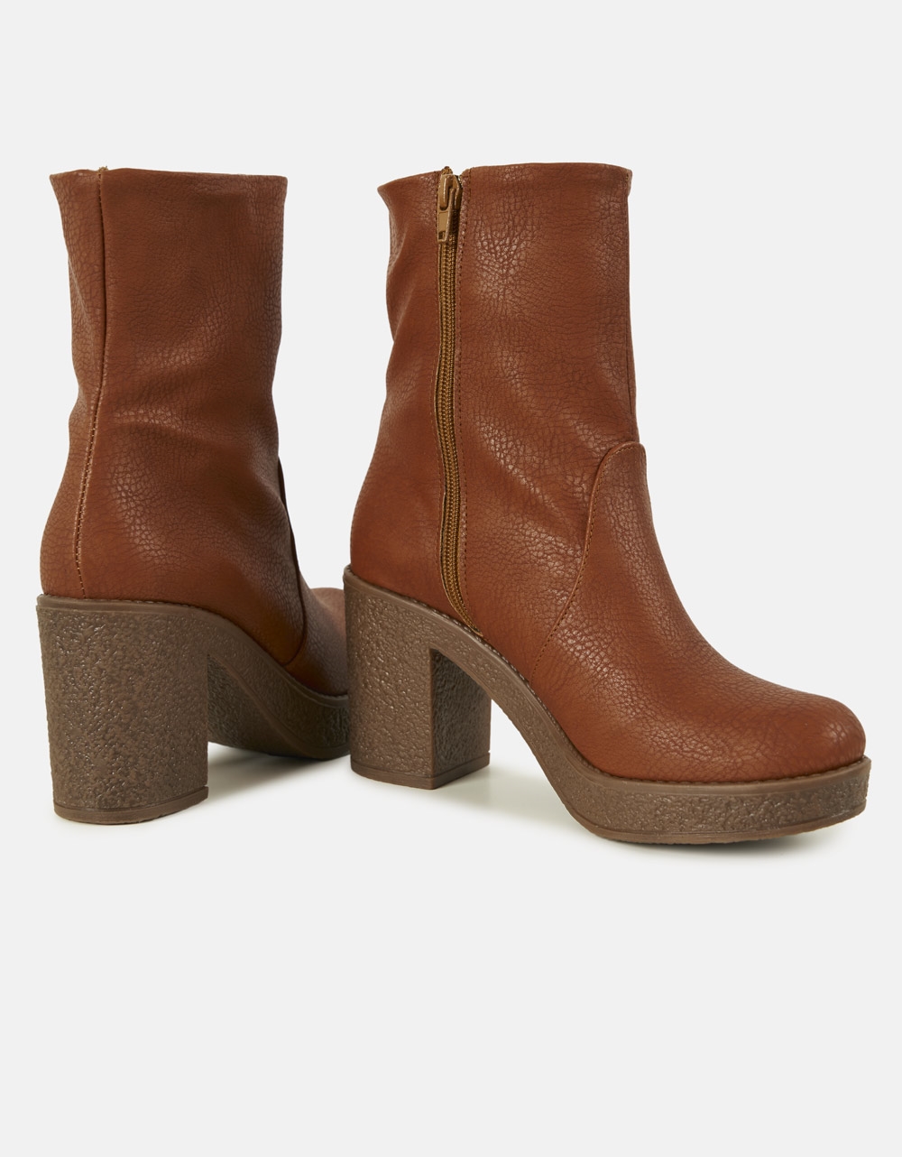 Μποτάκια μονόχρωμα με τακούνι Ελληνικής κατασκευής. Διαθέτουν τετράγωνο σταθερό τακούνι με ελαστική σόλα για άνετο πάτημα και κλείνουν με φερμουάρ. Είναι κατασκευασμένα από άριστης ποιότητας τεχνόδερμα ενώ εσωτερικά διαθέτουν φόδρα από ύφασμα. *Στο χρώμα πούρο εξωτερικά είναι κατασκευασμένα από συνθετικό καστόρι.