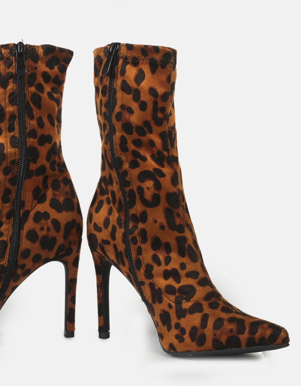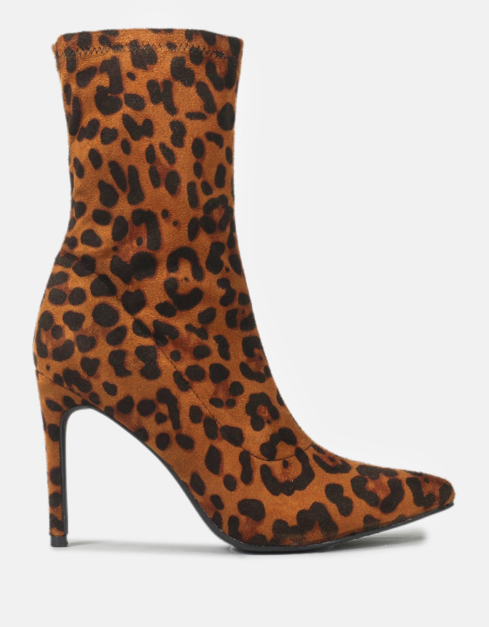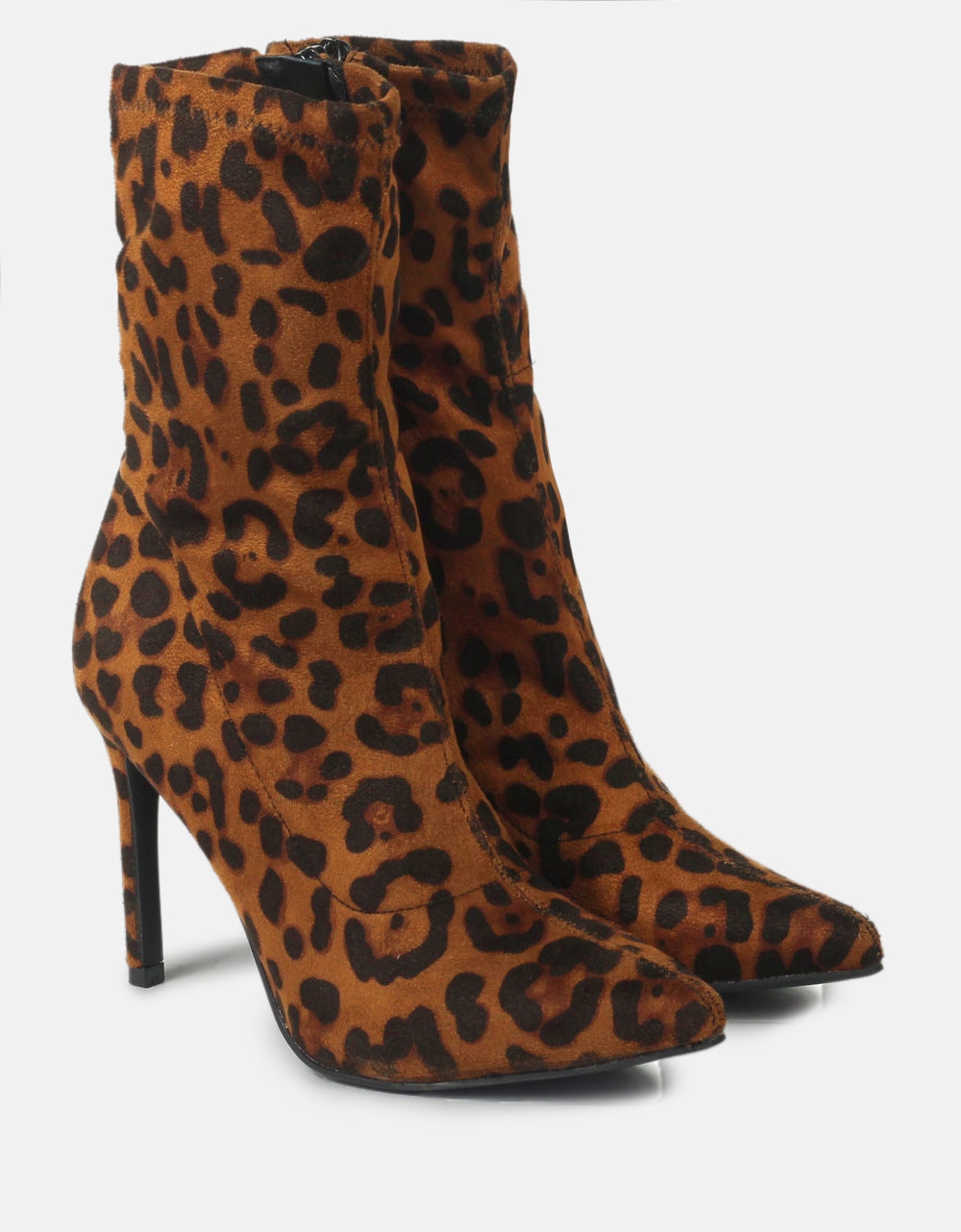 Μποτάκια suede μυτερά με λεπτό τακούνι και print Λεοπάρ