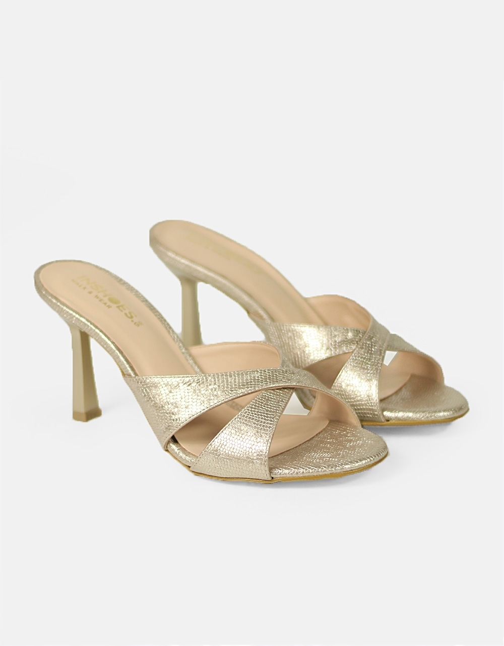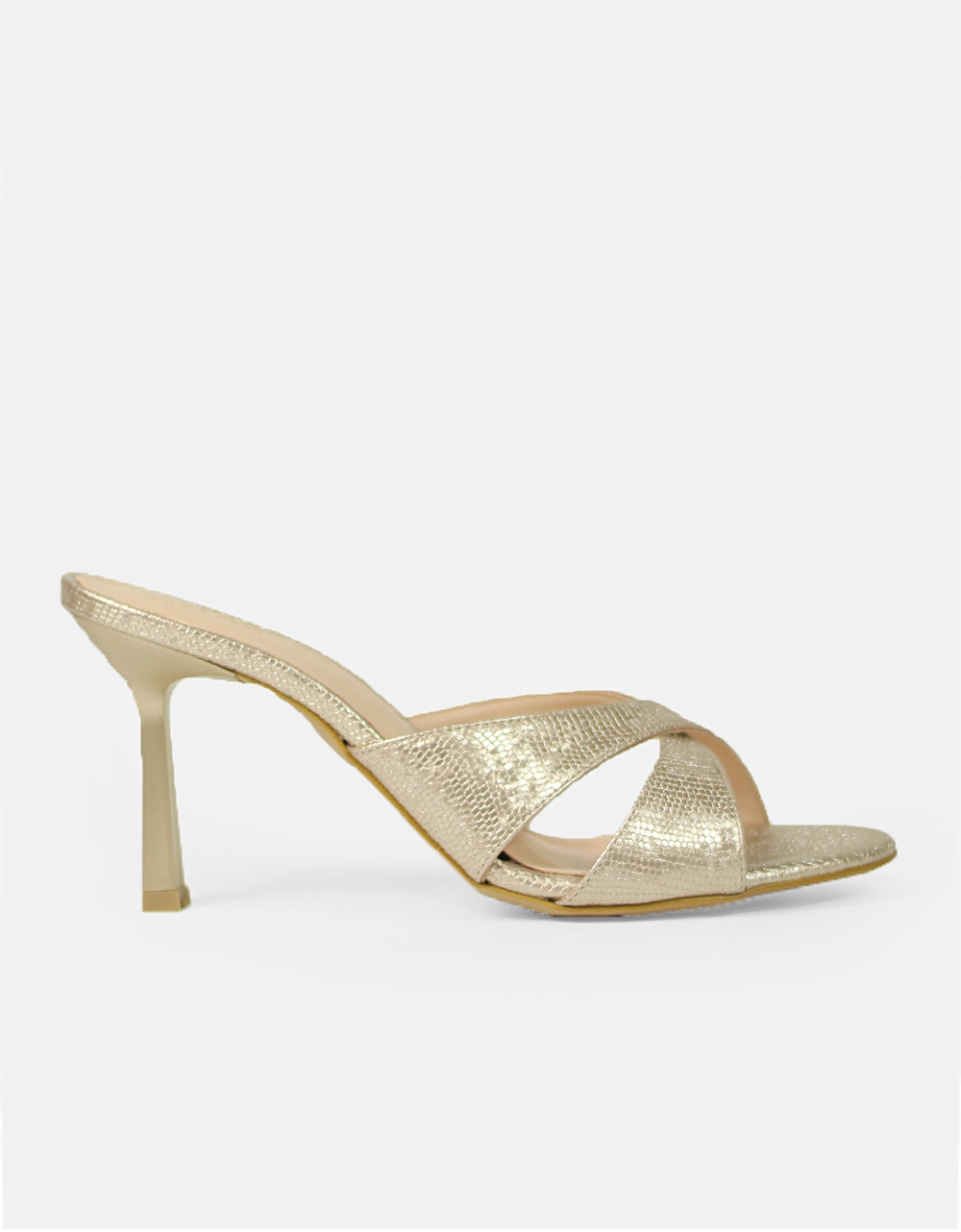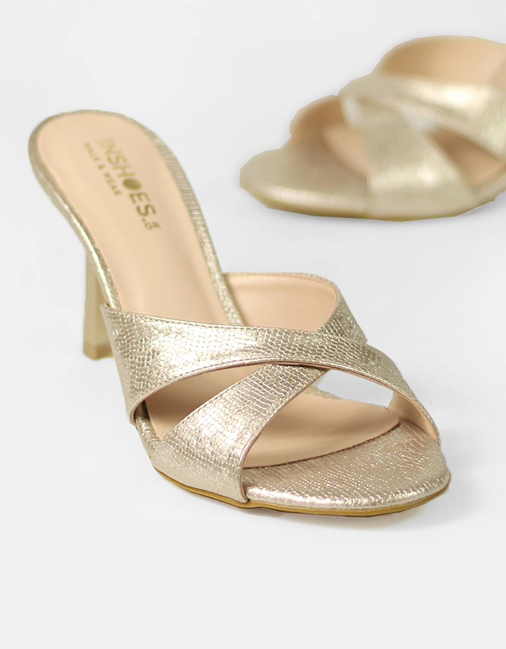 Mules Ελληνικής κατασκευής με λεπτό τακούνι. Διαθέτει χιαστί σχέδιο και πάτο από άριστης ποιότητας τεχνόδερμα για άνετο βαδισμα όλη μέρα.