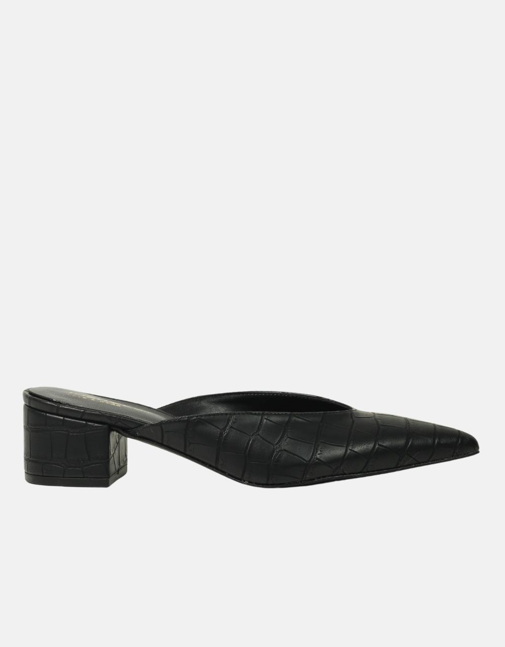 Mules Ελληνικής κροκο κατασκευής σε μυτερή γραμμή. Διαθέτουν καρέ τακούνι και αντιολισθητική ελαστική σόλα για άνετο βάδισμα καθόλη τη διάρκεια της ημέρας.