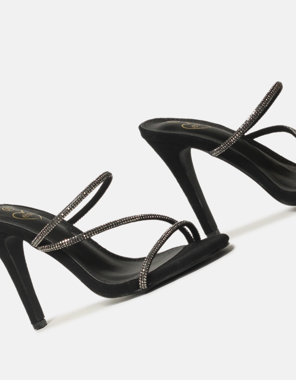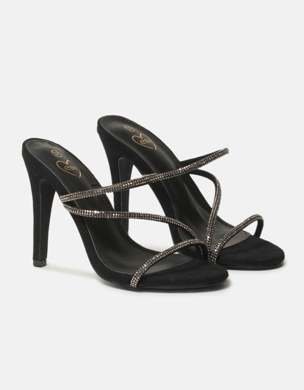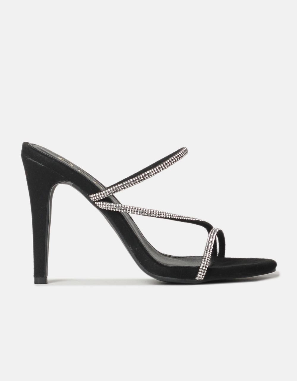 Ψηλοτάκουνα mules με λεπτό τακούνι. Διαθέτουν λουράκια διακοσμημένα με strass ενώ το τακούνι τους διαθέτει επένδυση από συνθετικό καστόρι.