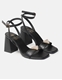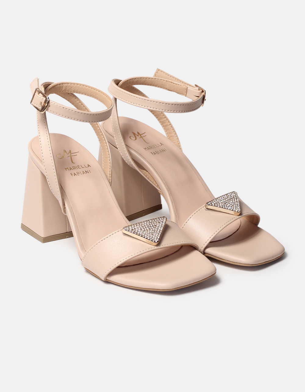 Δερμάτινα open heel πέδιλα Mariella Fabiani Ελληνικής κατασκευής με λεπτομέρεια από strass. Διαθέτουν τετράγωνο σταθερό τακούνι και δένουν με μπαρέτα στονα στράγαλο.