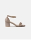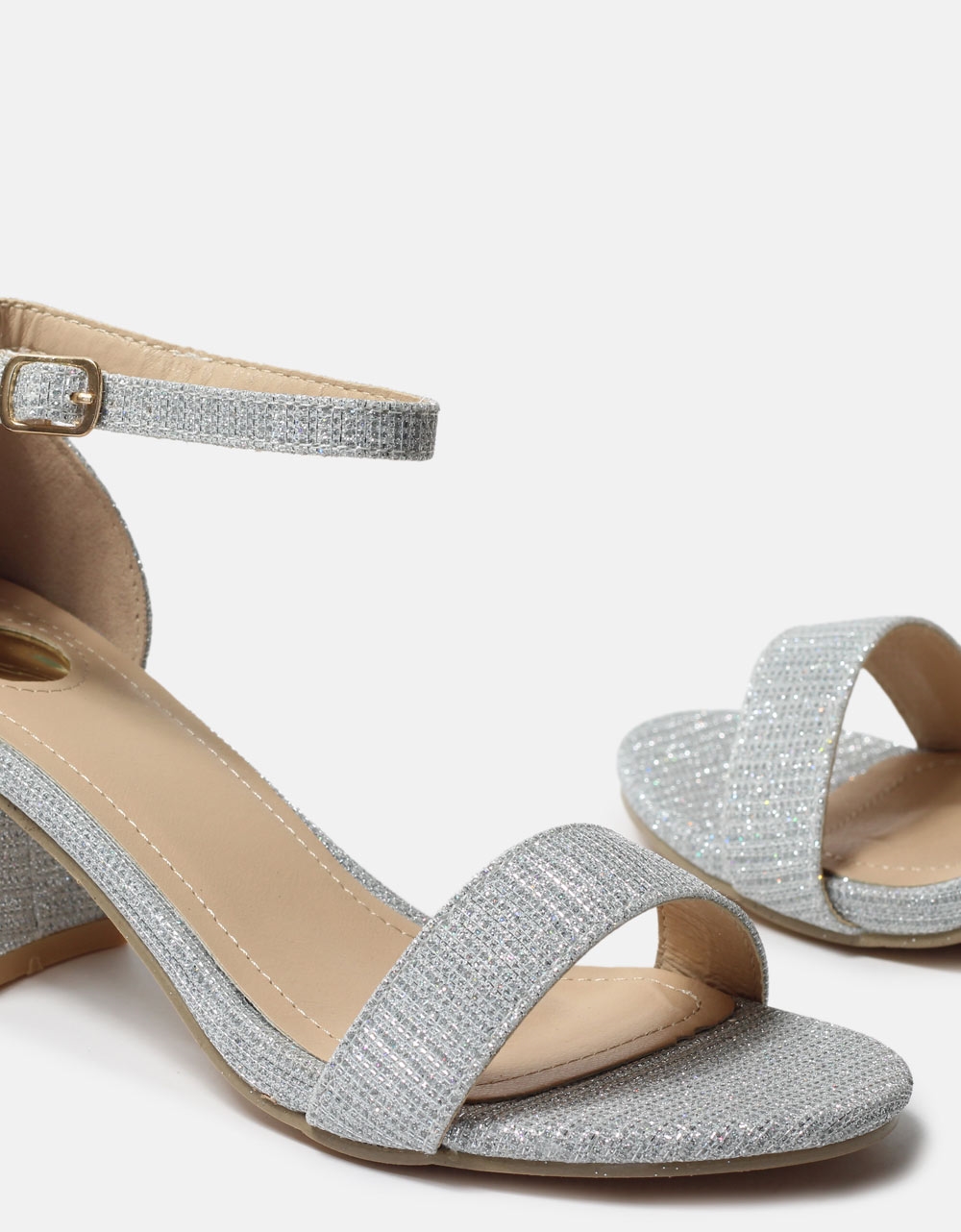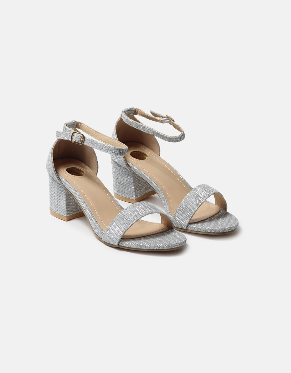 Χαμηλά πέδιλα από glitter υλικό. Δένουν με μπαρέτα στο ύψος του αστραγάλου, ενώ διαθέτουν χαμηλό τετράγωνο τακούνι για άνετο βάδισμα.
