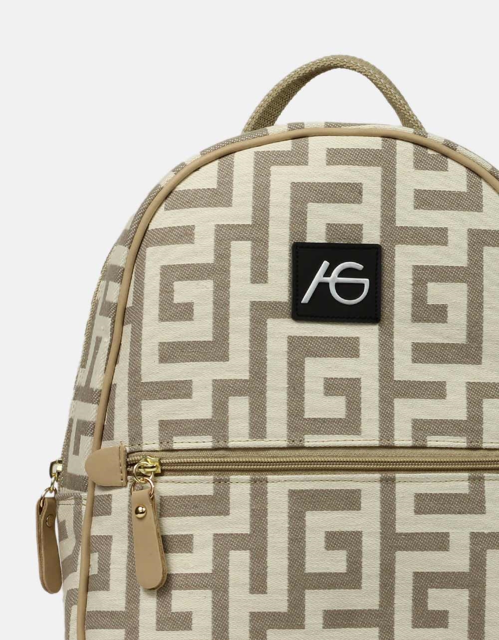Σακίδιο πλάτης χειροποίητο, Ελληνικής κατασκευής της εταιρείας ARI GORGIO, από ύφασμα με μαίανδρο. Διαθέτει προσαρμοζόμενα λουριά πλάτης και κλείνει με φερμουάρ.