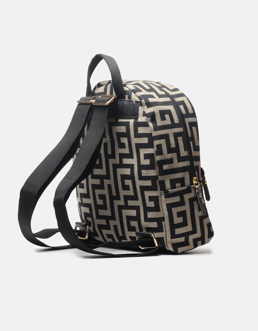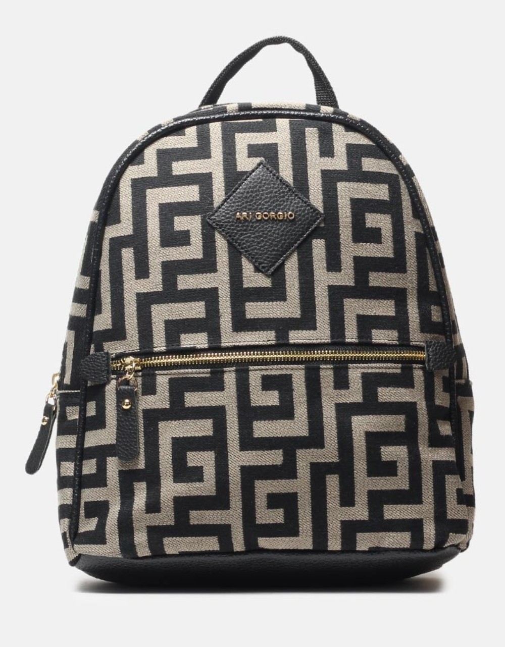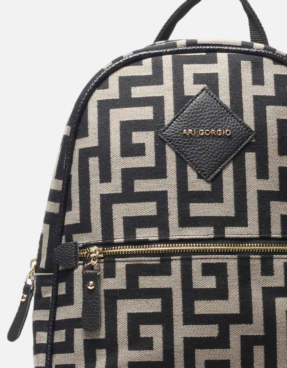 Σακίδιο πλάτης χειροποίητο, Ελληνικής κατασκευής της εταιρείας ARI GORGIO, από ύφασμα με μαίανδρο. Διαθέτει προσαρμοζόμενα λουριά πλάτης και κλείνει με φερμουάρ.