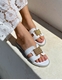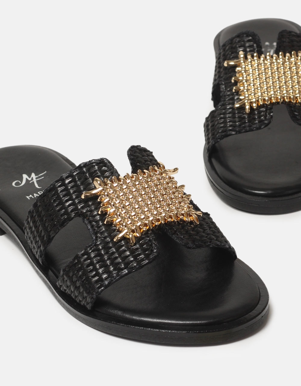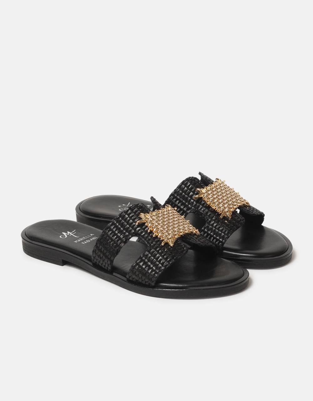Σανδάλια flat, Mariella Fabiani Ελληνικής κατασκευής με μεταλλικό διακοσμητικό της εταιρίας Mariella Fabiani. Διαθέτουν αφρώδη πάτο από γνήσιο δέρμα και ελαστική σόλα για άνετο βάδισμα.