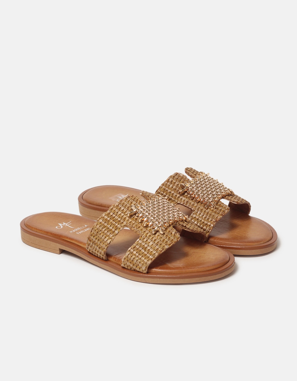 Σανδάλια flat, Mariella Fabiani Ελληνικής κατασκευής με μεταλλικό διακοσμητικό της εταιρίας Mariella Fabiani. Διαθέτουν αφρώδη πάτο από γνήσιο δέρμα και ελαστική σόλα για άνετο βάδισμα.