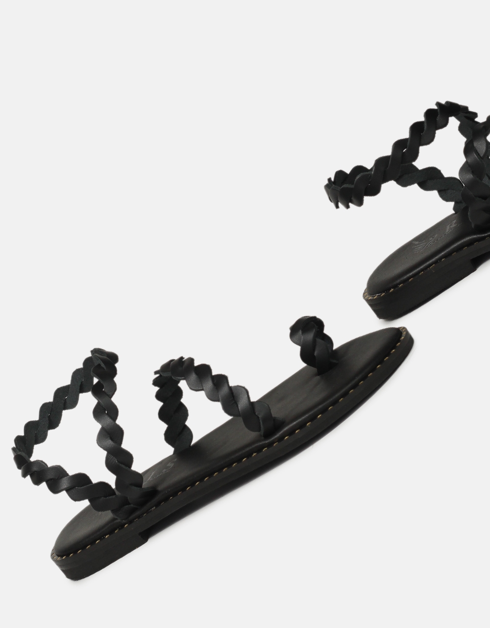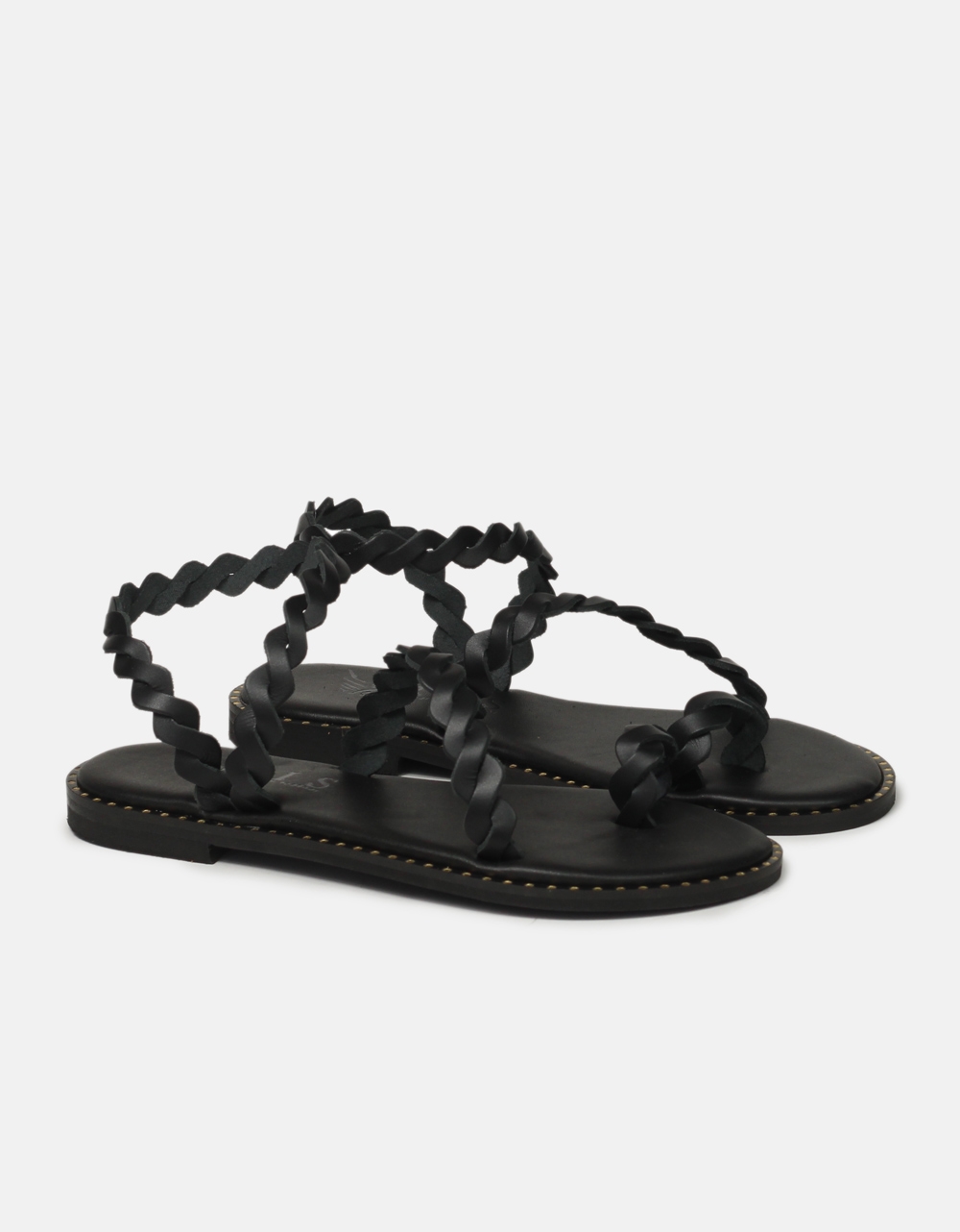 Δερμάτινα flat σανδάλια Ελληνικής κατασκευής της εταιρείας IRIS με σχέδιο κοτσιδάκι. Διαθέτουν περαστό λουράκι αστραγάλου και toe ring.