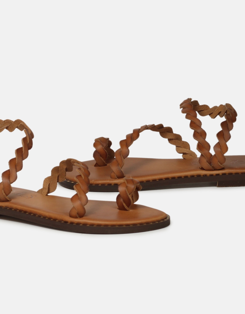 Δερμάτινα flat σανδάλια Ελληνικής κατασκευής της εταιρείας IRIS με σχέδιο κοτσιδάκι. Διαθέτουν περαστό λουράκι αστραγάλου και toe ring.