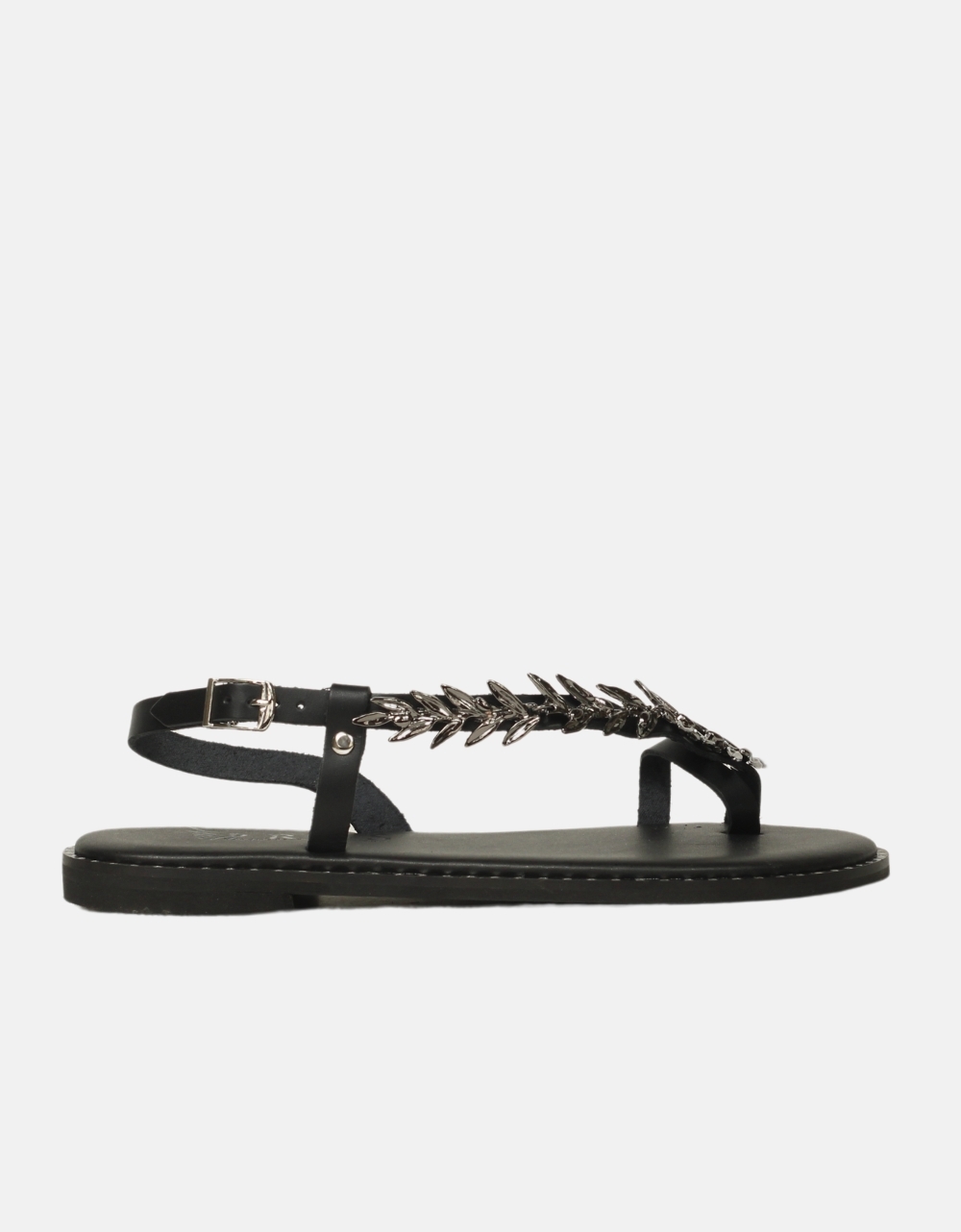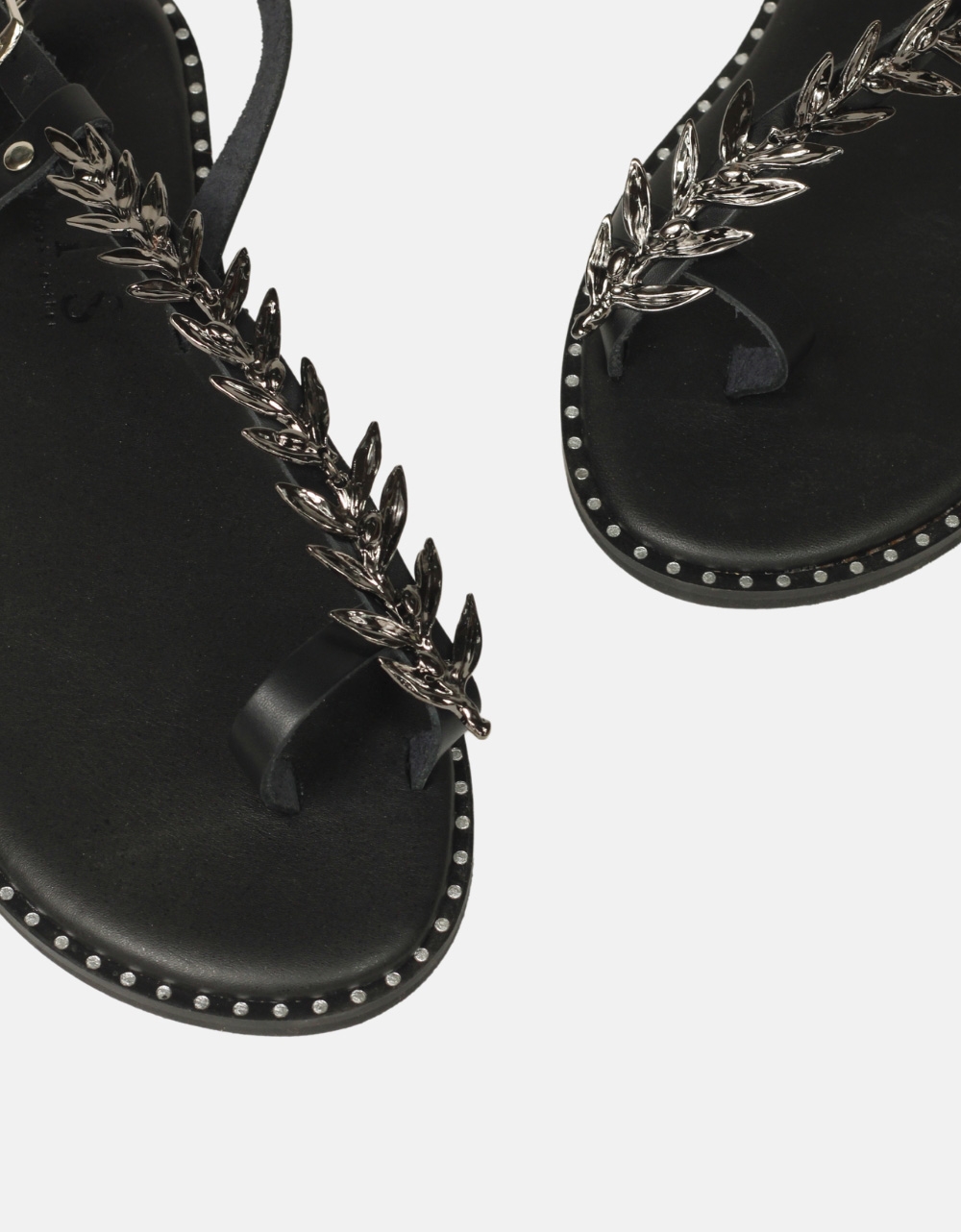 Δερμάτινα flat σανδάλια Ελληνικής Κατασκευής με φύλλα ελιάς Μαύρο