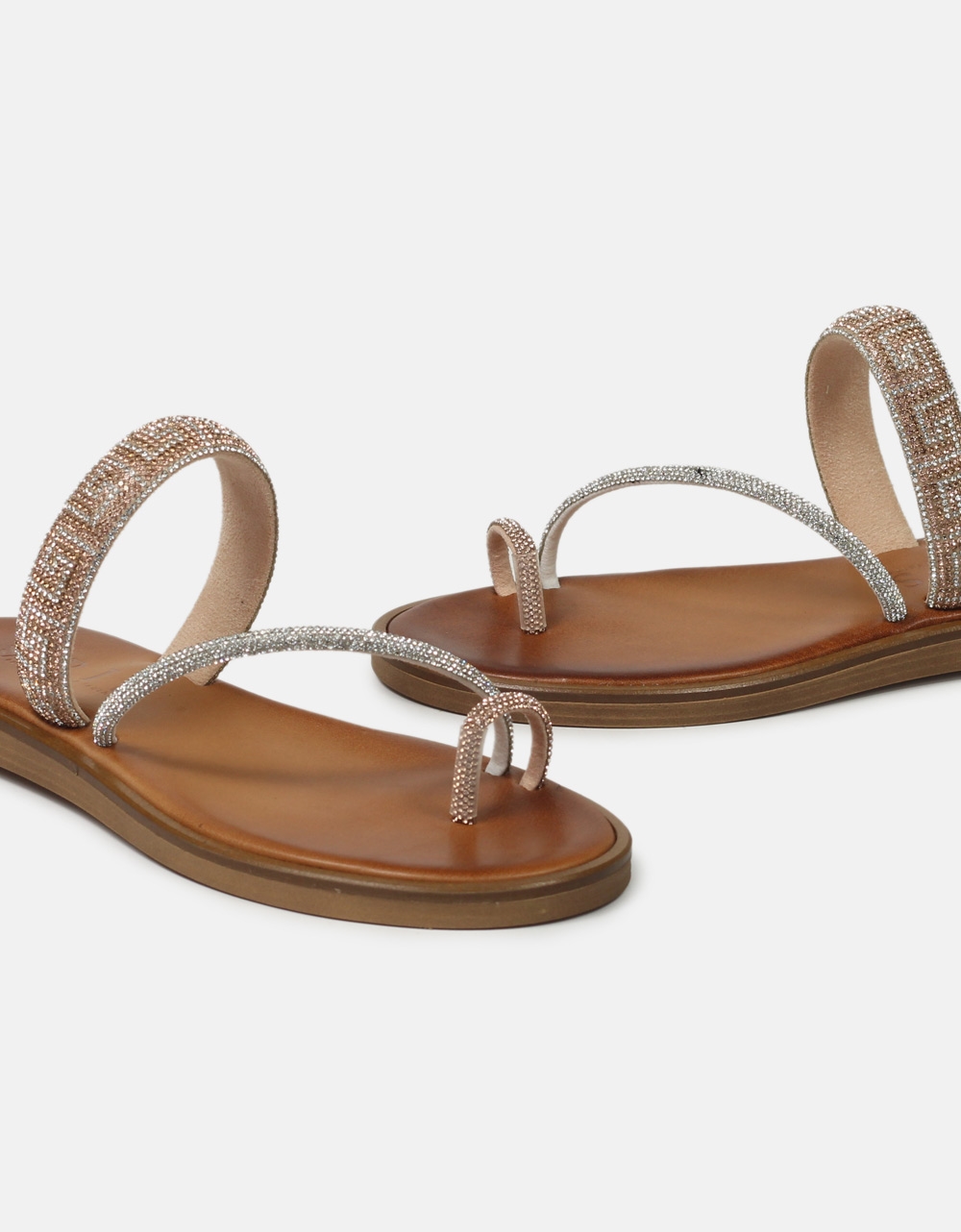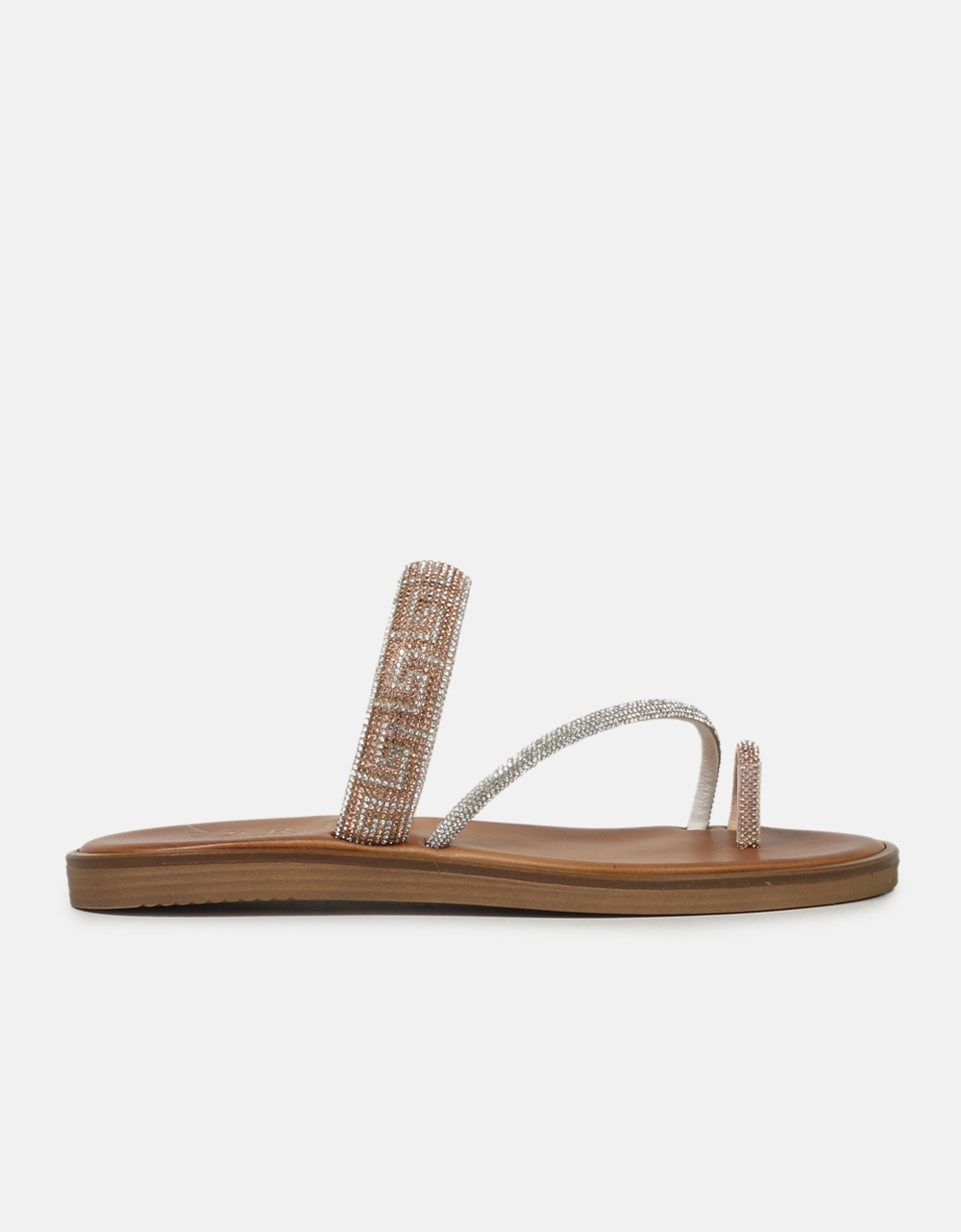 Δερμάτινα flat σανδάλια Ελληνικής κατασκευής της εταιρείας IRIS, διακοσμημένα με strass σε μοτίβο μαιάνδρου. Είναι κατασκευασμένα από άριστης ποιότητας γνήσιο δέρμα.