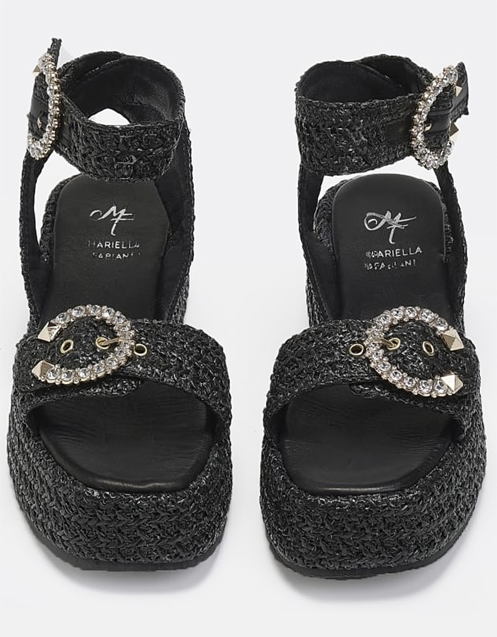 Δερμάτινα flatforms ψάθινα Ελληνικής κατασκευής με τοκά strassτης εταιρίας Mariella Fabiani. Διαθέτουν αφρώδη πάτο από γνήσιο δέρμα για άνετο πάτημα.