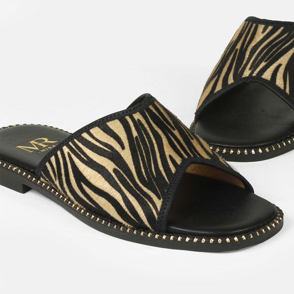 Δερμάτινα σανδάλια Ελληνικής κατασκευής με φάσα animal print. Διαθέτουν αφρώδη δερμάτινο πάτο και ελαστική αντιολισθητική σόλα για άνετο βάδισμα.