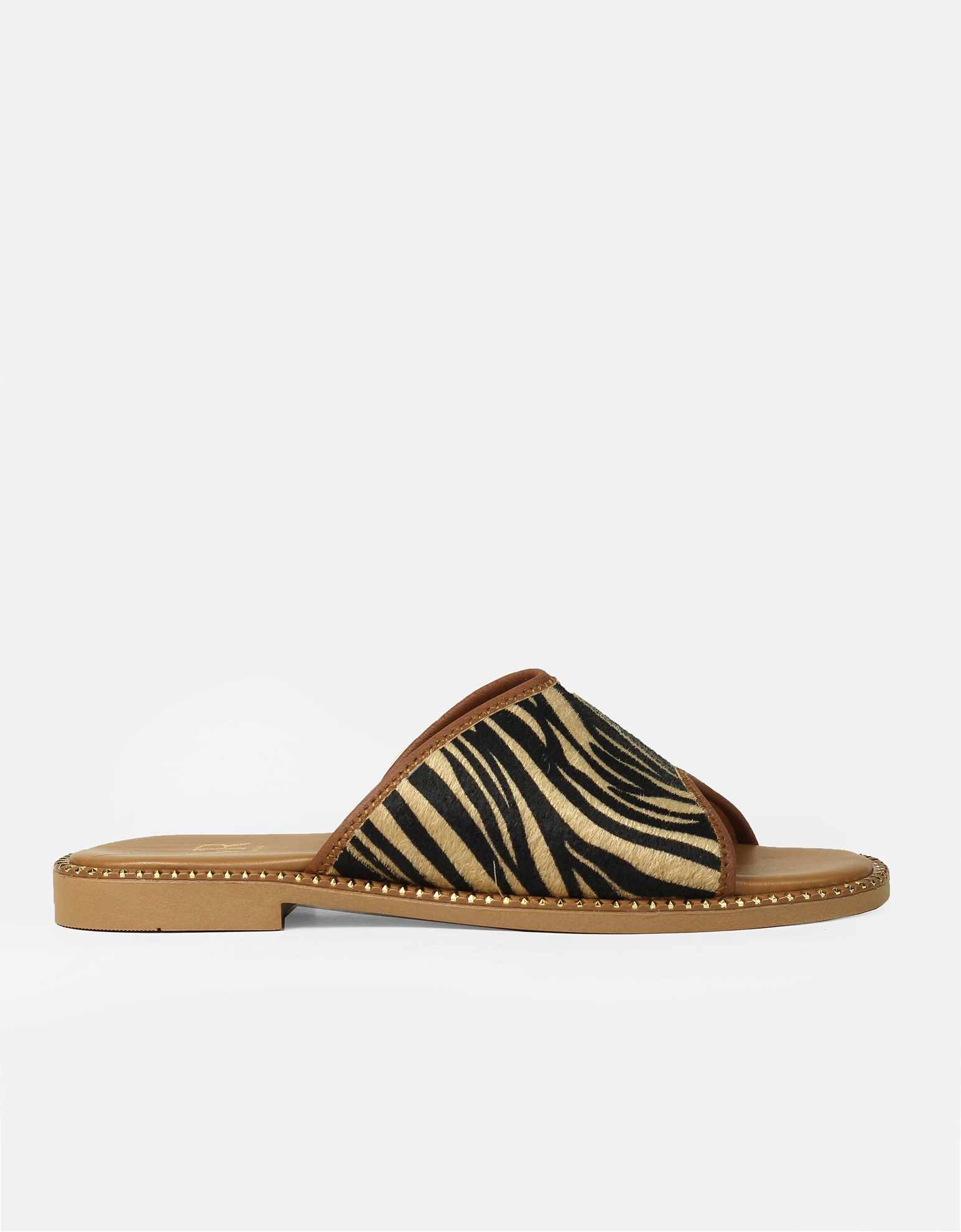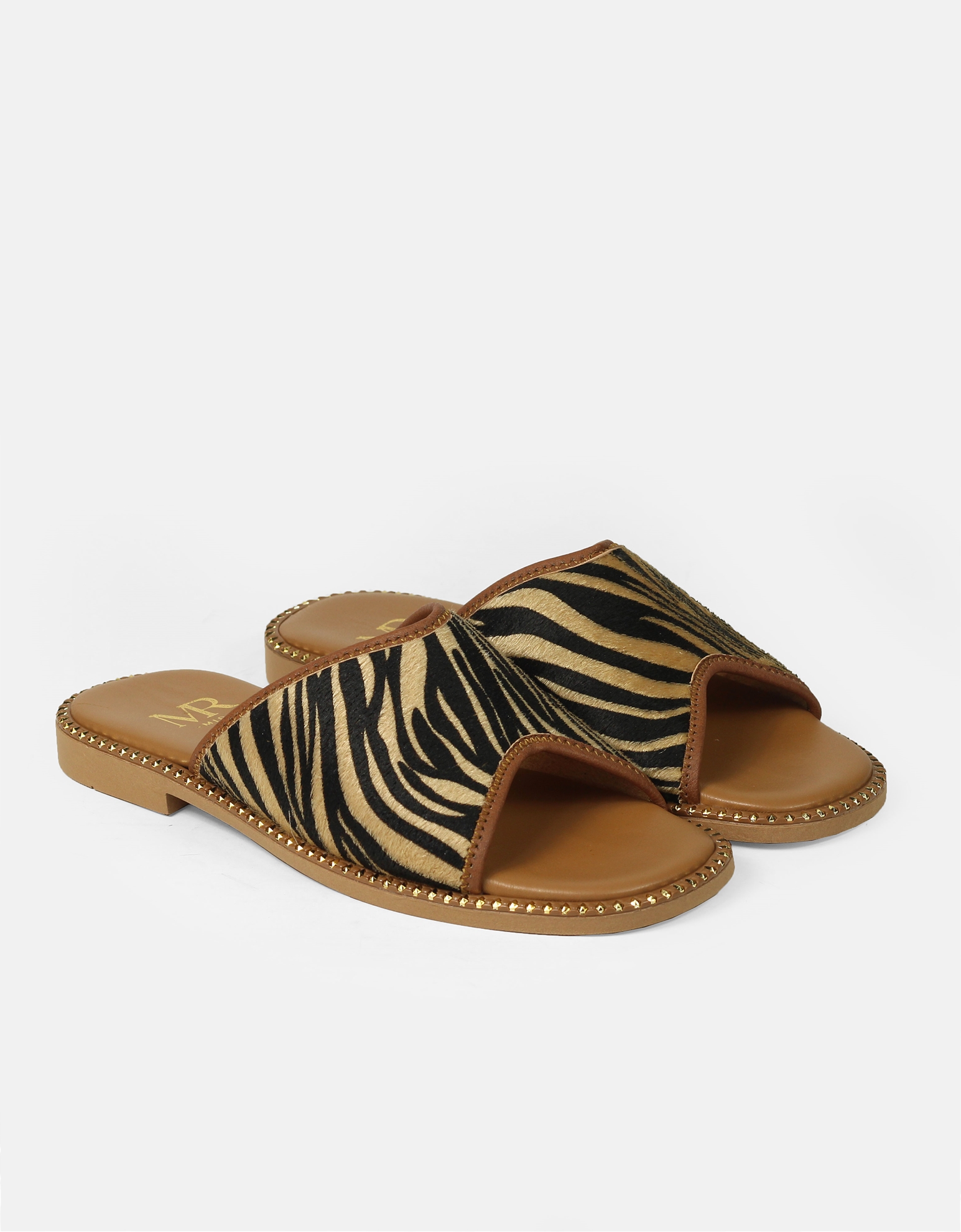 Δερμάτινα σανδάλια Ελληνικής κατασκευής με φάσα animal print. Διαθέτουν αφρώδη δερμάτινο πάτο και ελαστική αντιολισθητική σόλα για άνετο βάδισμα.