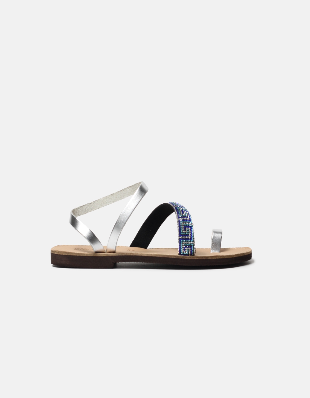 Δερμάτινα flat σανδάλια Ελληνικής κατασκευής. Διαθέτουν λοξό λουράκι με μοτίβο μαιάνδρου από strass και ελαστική σόλα για άνετο βάδισμα.