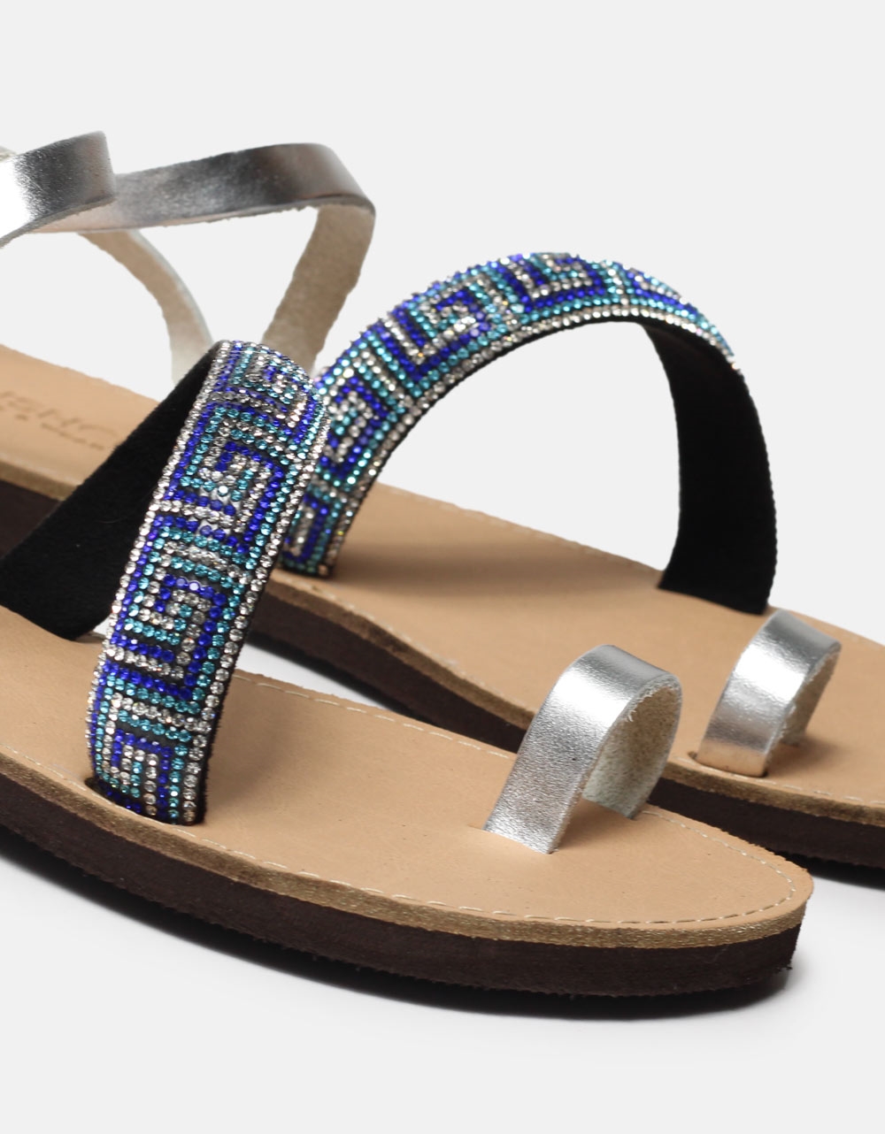 Δερμάτινα σανδάλια Ελληνικής κατασκευής με λοξό λουράκι strass Μπλε