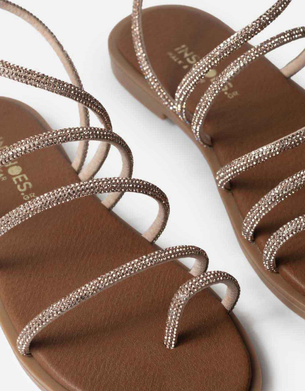 Δερμάτινα σανδάλια Ελληνικής κατασκευής, με δάχτυλο και λουράκια από strass. Διαθέτουν αφρώδη πάτο από γνήσιο δέρμα και ελαστική σόλα για άνετο βάδισμα.
