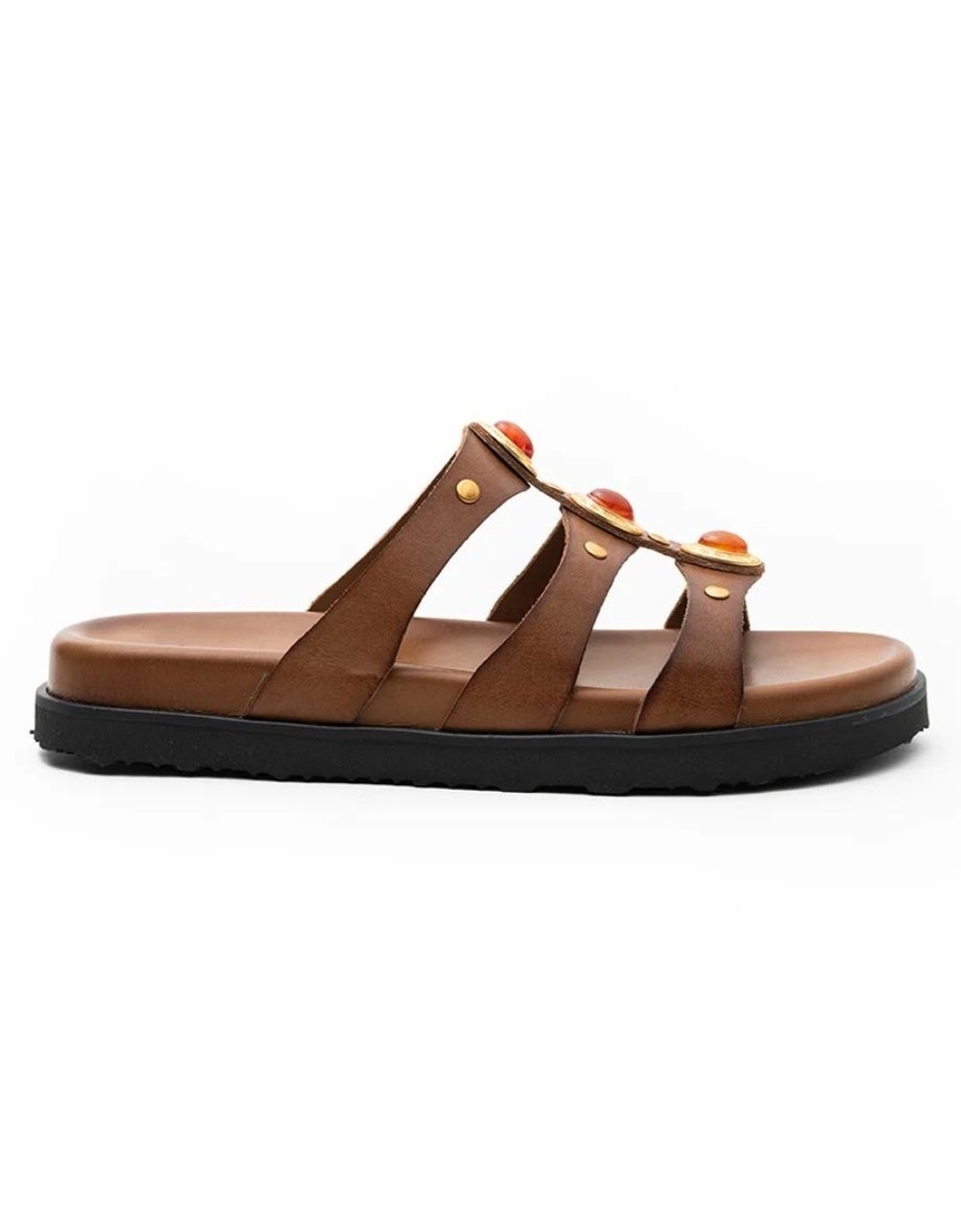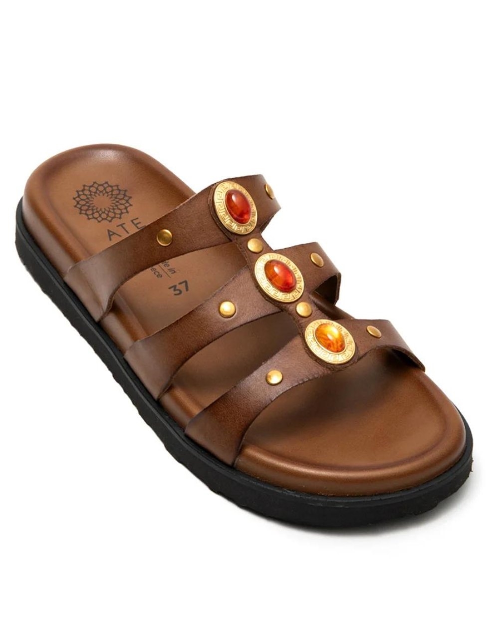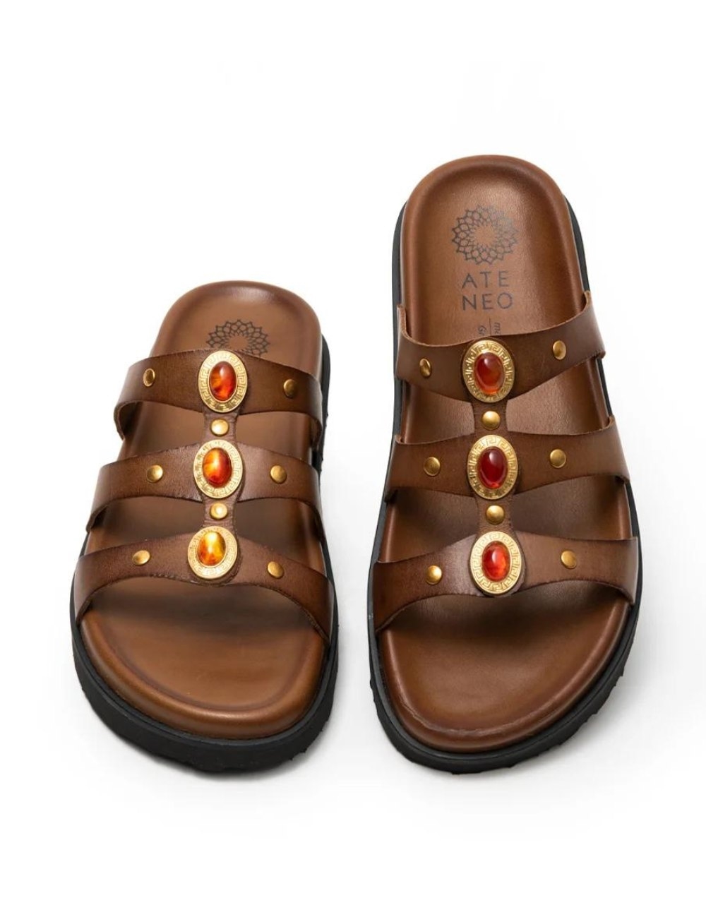 Δερμάτινα σανδάλια Ελληνικής κατασκευής της εταιρείας ATENEO. Διαθέτουν διακοσμητικά πετράδια στη φάσα και σχεδιασμό κατάλληλο για ιδιαίτερα άνετο βάδισμα.