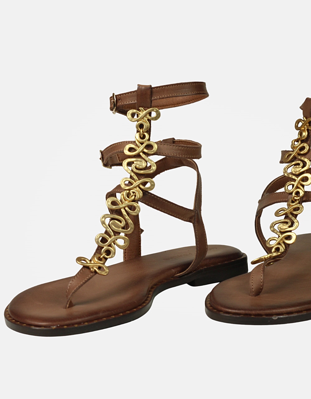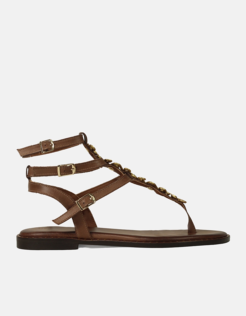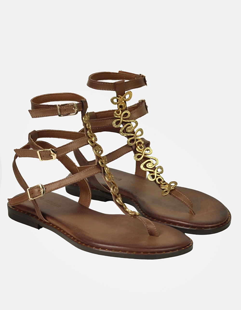Δερμάτινα φλατ σανδάλια Ελληνικής Κατασκευής με μεταλλικό στοιχείο Καφέ