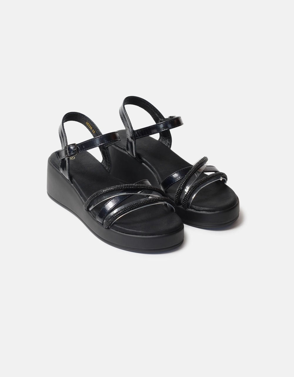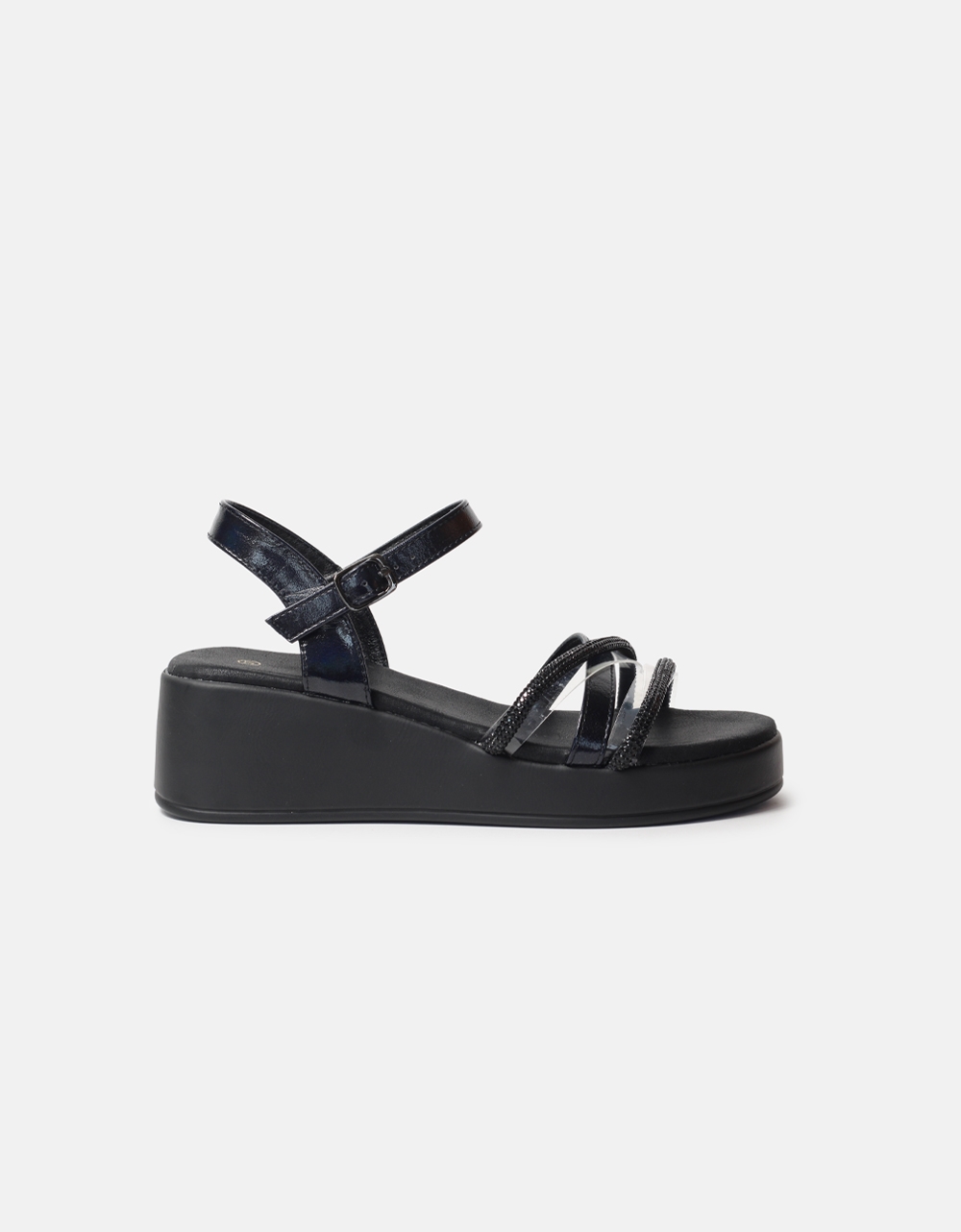 Σανδάλια flatforms μονόχρωμα. Διαθέτουν λεπτομέρειες με διάφανα λουράκια και strass, ενώ δένουν με μπαρέτα στο ύψος του αστραγάλου.