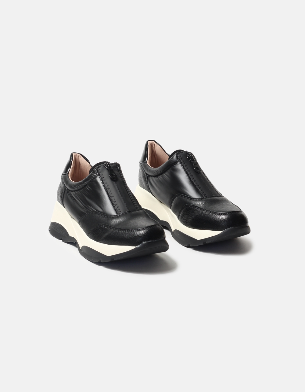 Basic sneakers σε συνδυασμό υλικών και χρωμάτων. Διαθέτουν διπλή chunky ελαστική σόλα για άνετο βάδισμα και κλείνουν με φερμουάρ.