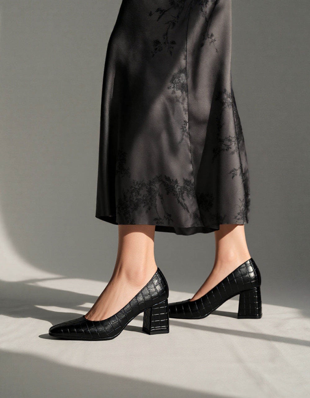 Μονόχρωμες γόβες Ελληνικής κατασκευής με κροκό υφή. Διαθέτουν καρέ τακούνι και αντιολισθητική - ελαστική σόλα για άνετο βάδισμα καθόλη τη διάρκεια της ημέρας.
