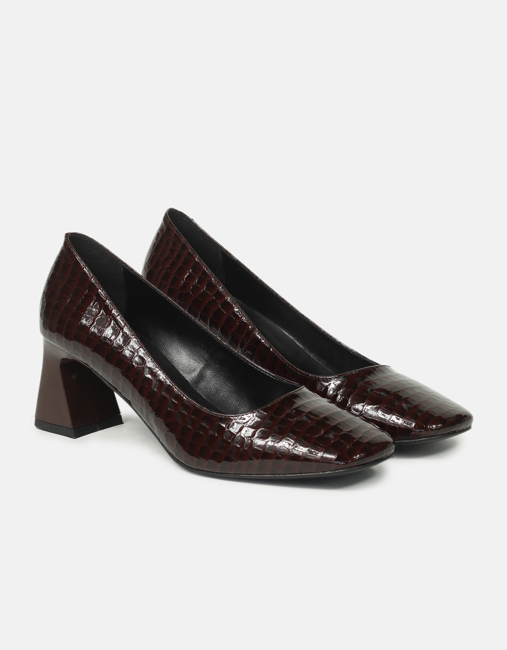 Γόβες κροκό σε καρέ γραμμή Ελληνικής κατασκευής από λουστρίνι. Εσωτερικά διαθέτουν πάτο από γνήσιο δέρμα και αντιολισθητική σόλα για άνετο βάδισμα.