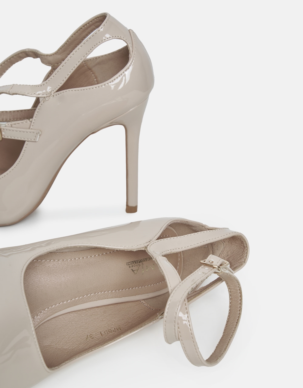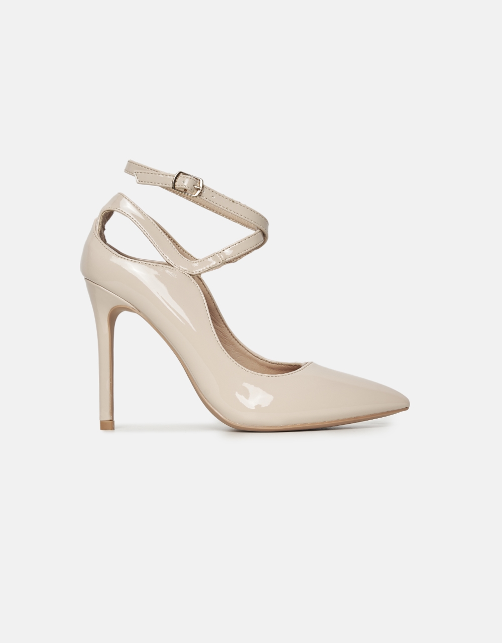 Γόβες λουστρίνι μυτερές, με χιαστί μπαρέτα στο ύψος του αστραγάλου. Είναι κατασκευασμένες από άριστης ποιότητας λουστρίνι.