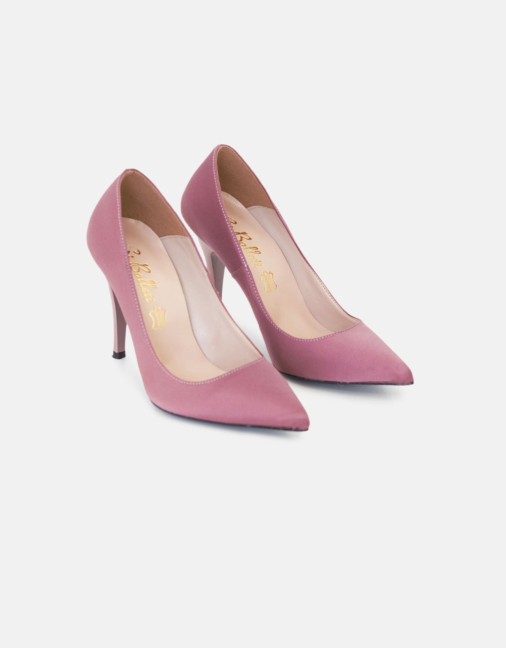 Μονόχρωμες σατέν μυτερές ψηλοτάκουνες γόβες, Ελληνικής κατασκευής. Διαθέτουν πάτο από γνήσιο δέρμα και μαλακή σόλα από κροπόν για άνετο βάδισμα.