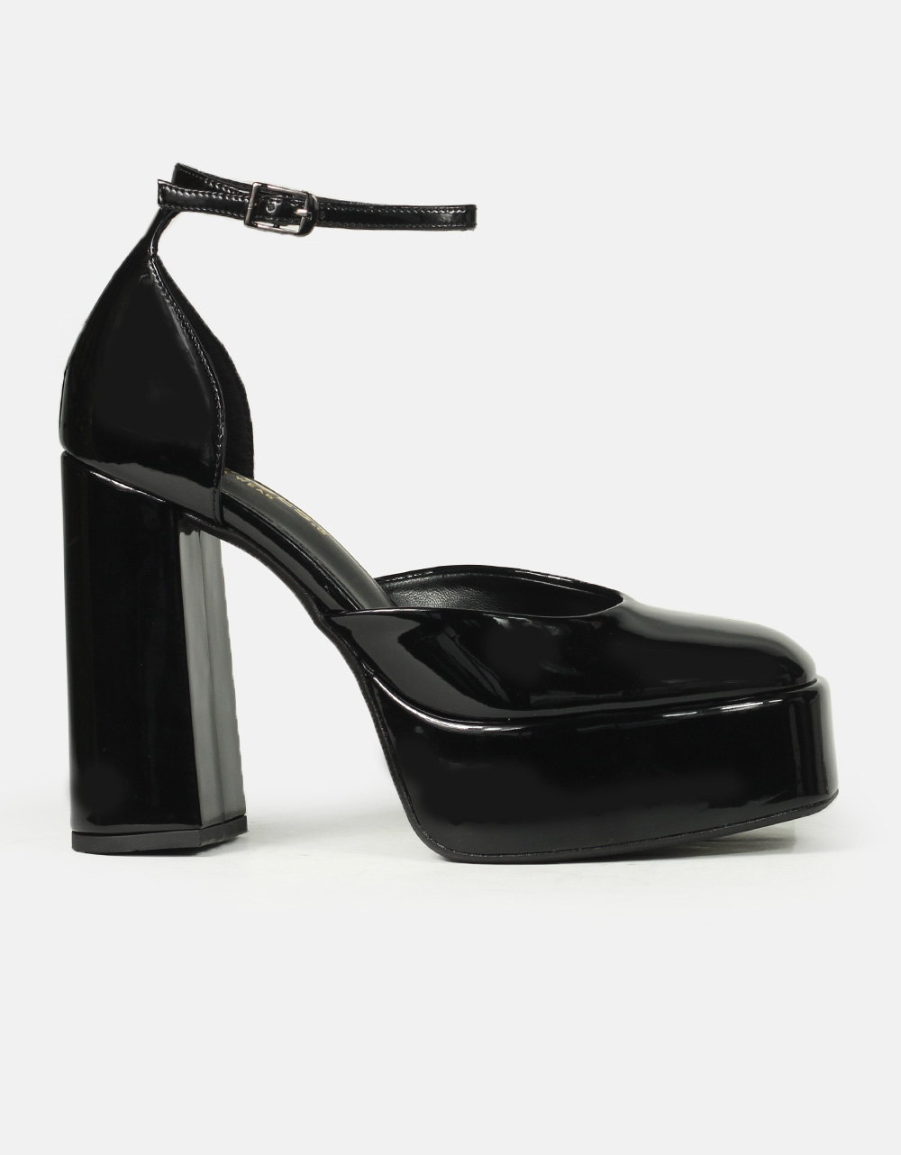 Ψηλοτάκουνες λουστρίνι γόβες Ελληνικής κατασκευής, μονόχρωμες. Διαθέτουν τετράγωνο σταθερό τακούνι και φιάπα, ενώ δένουν με μπαρέτα στο ύψος του αστραγάλου