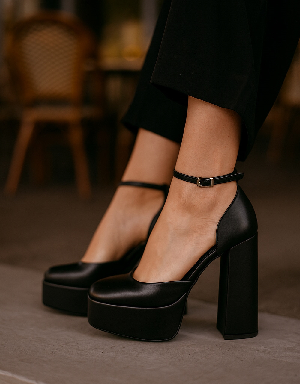 Ψηλοτάκουνες γόβες Ελληνικής κατασκευής, μονόχρωμες. Διαθέτουν τετράγωνο σταθερό τακούνι και φιάπα, ενώ δένουν με μπαρέτα στο ύψος του αστραγάλου