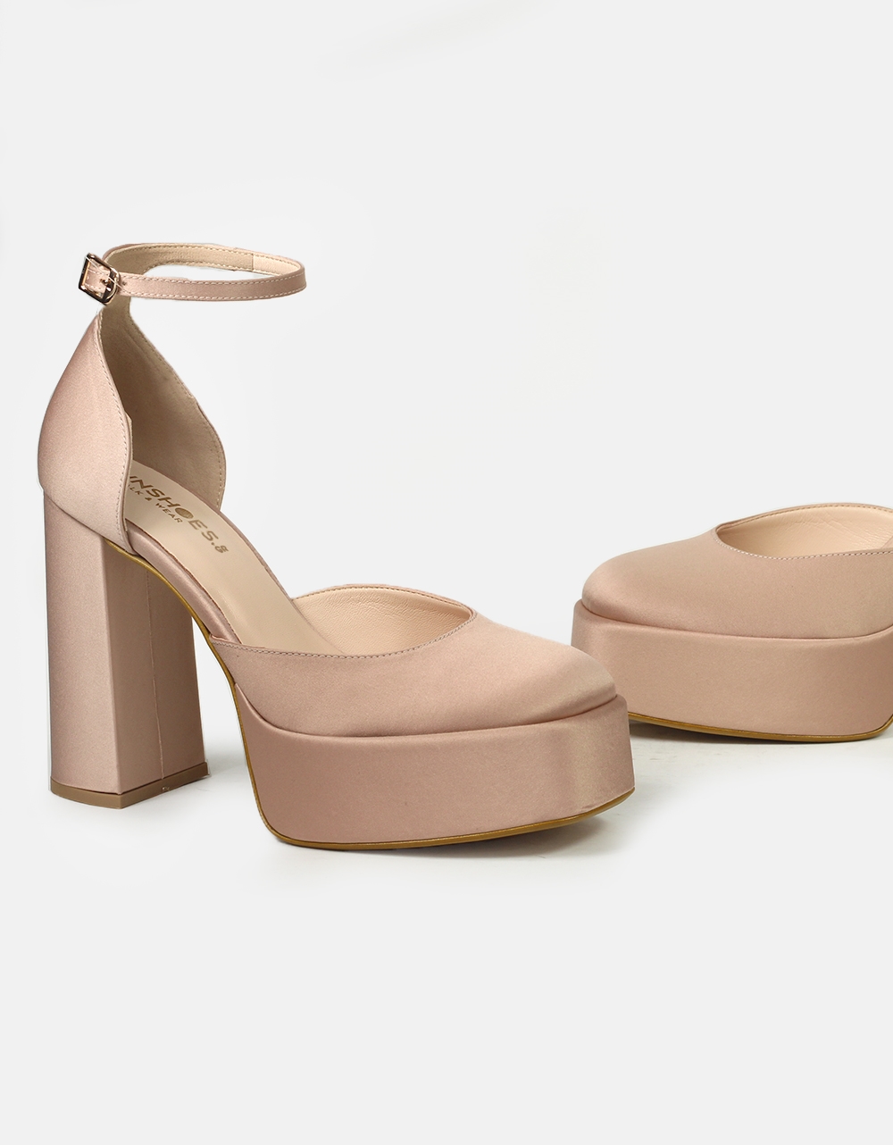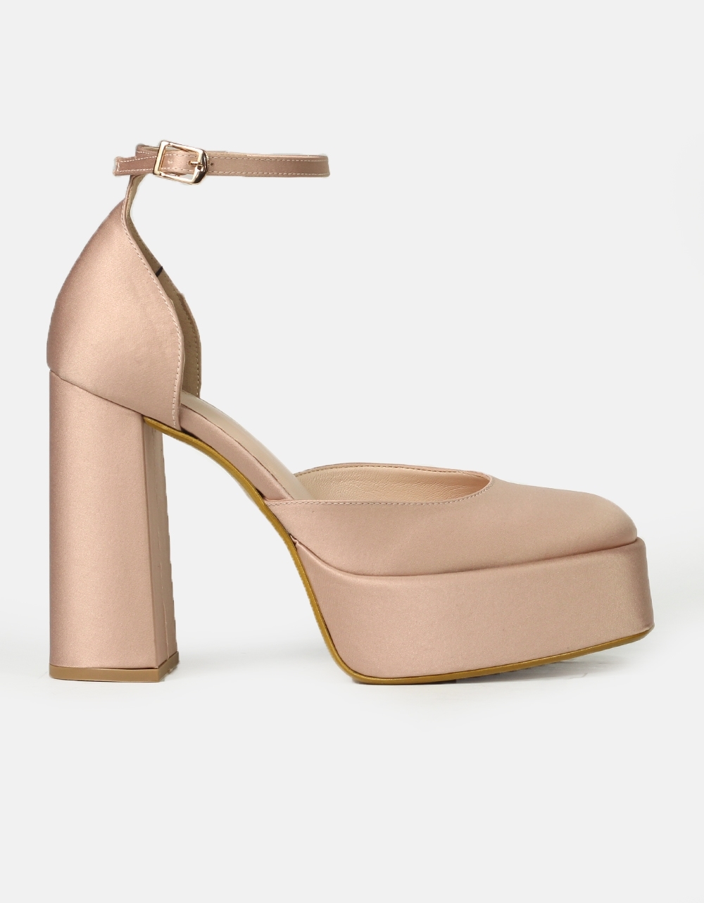 Σατέν ψηλοτάκουνες γόβες Ελληνικής κατασκευής, μονόχρωμες. Διαθέτουν τετράγωνο σταθερό τακούνι και φιάπα, ενώ δένουν με μπαρέτα στο ύψος του αστραγάλου