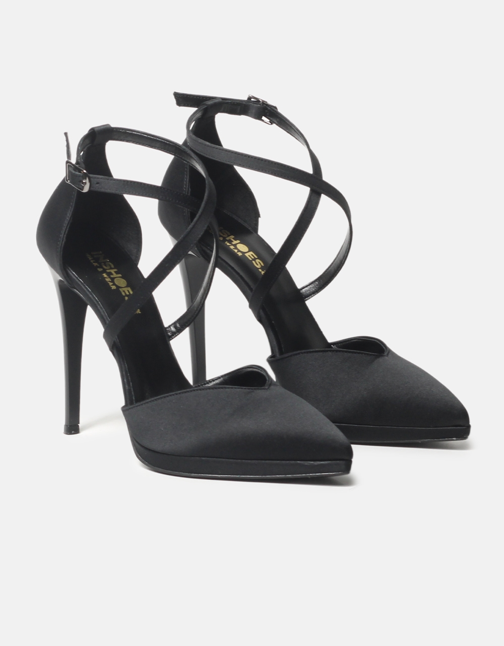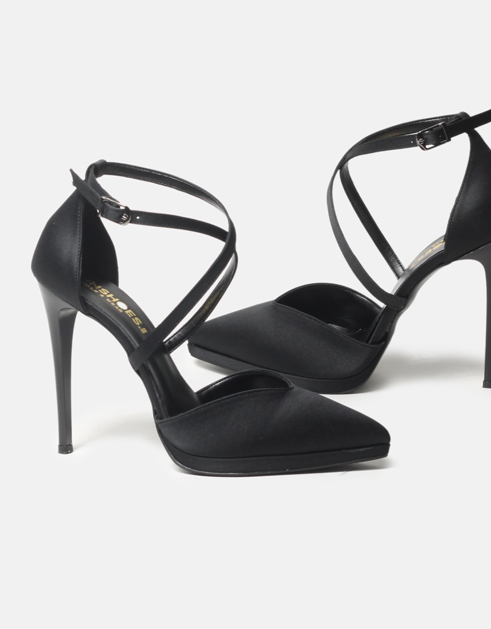 Σατέν ψηλοτάκουνες γόβες Ελληνικής κατασκευής με χιαστί σχέδιο Μαύρο