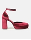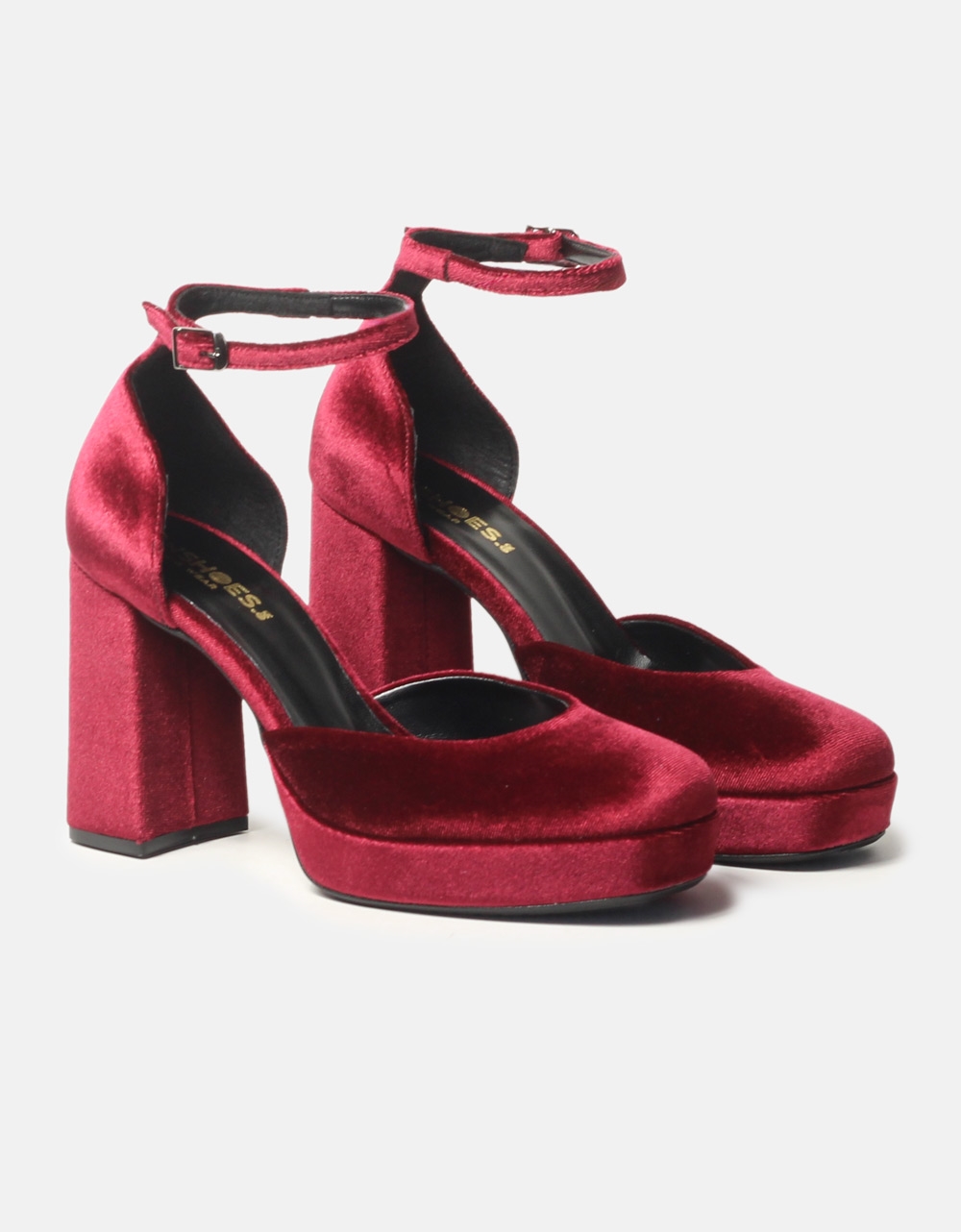Velvet ψηλοτάκουνες γόβες, Ελληνικής κατασκευής. Διαθέτουν τετράγωνο σταθερό τακούνι και φιάπα, με ιδιαίτερα μαλακό πάτημα, ενώ δένουν με μπαρέτα στο ύψος του αστραγάλου.